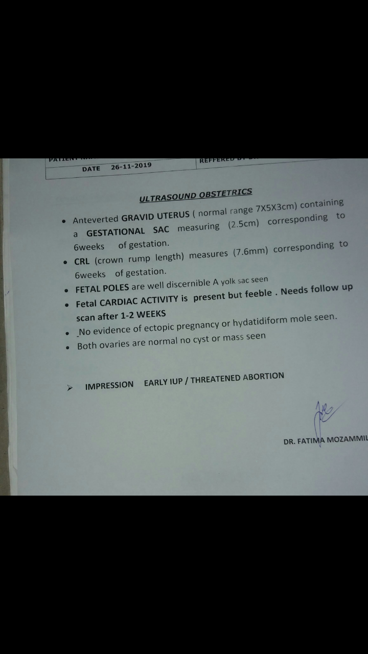 Ye mari aj ki ultrasound ki report hai doctor ny kha hai heartbeat bht slow h baby ki ye risk hai mari LMP 28 September hai aur ultrasound k hisab sy 6week hain main bht pryshan hun kia kru heartbeat q slow h??? Main hr hafty gravibinan injection b lgwa rhi hun duphston 2time ly rhi loprin aur folic acid b ly rhi rozana please mjhy btaye main kia kru kaisy heartbeat theek hoge mera April mai aik br miscarriage ho chuka hai???????????? kia kru kaisy theek hoge heartbeat