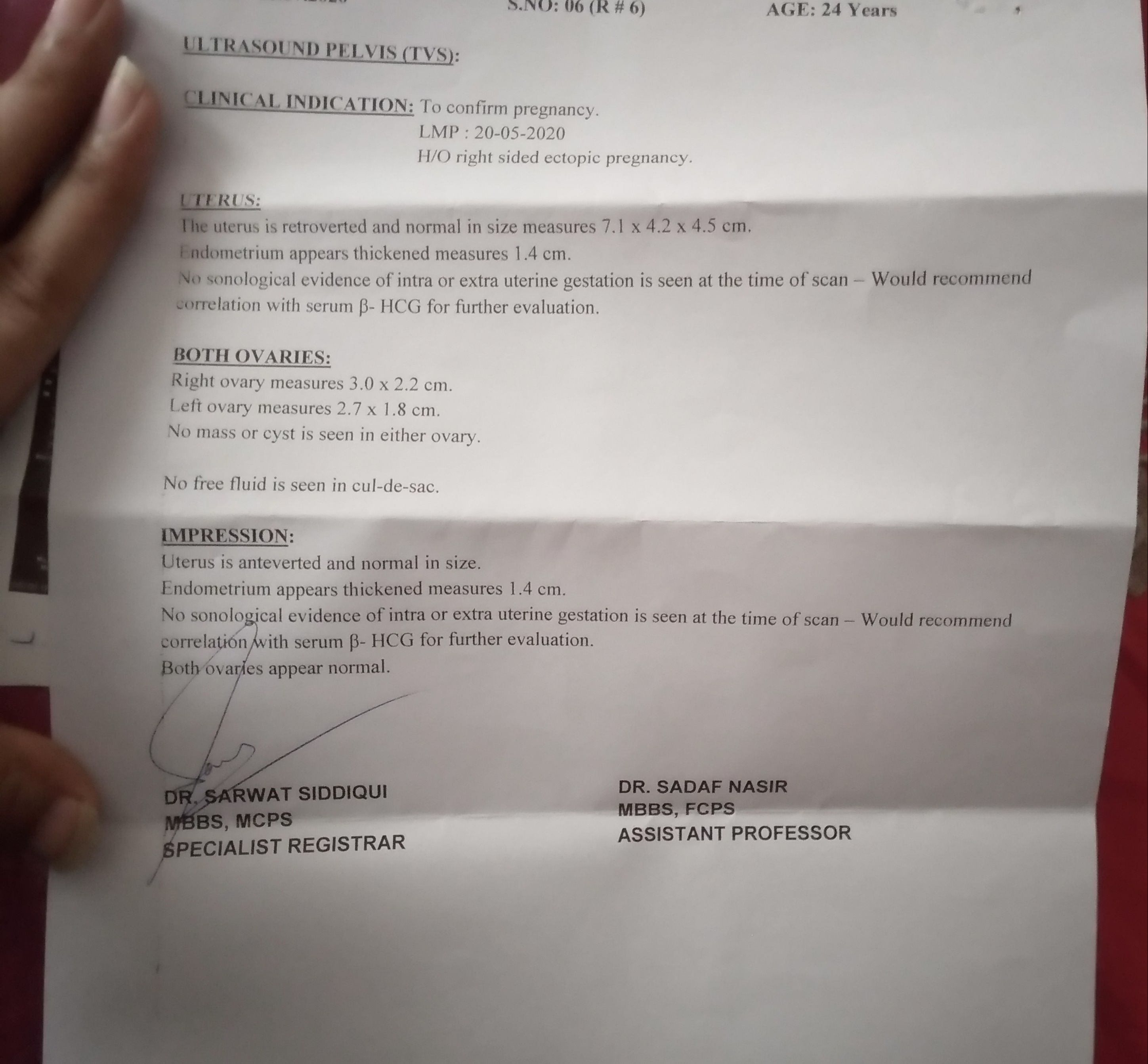 my dear patient show me report of ultrasound. high suspicion of second ectopic.