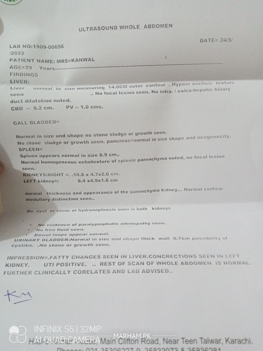 u have fatty liver + kidney concretion +UTI+ fibroid also ....u facing many issues