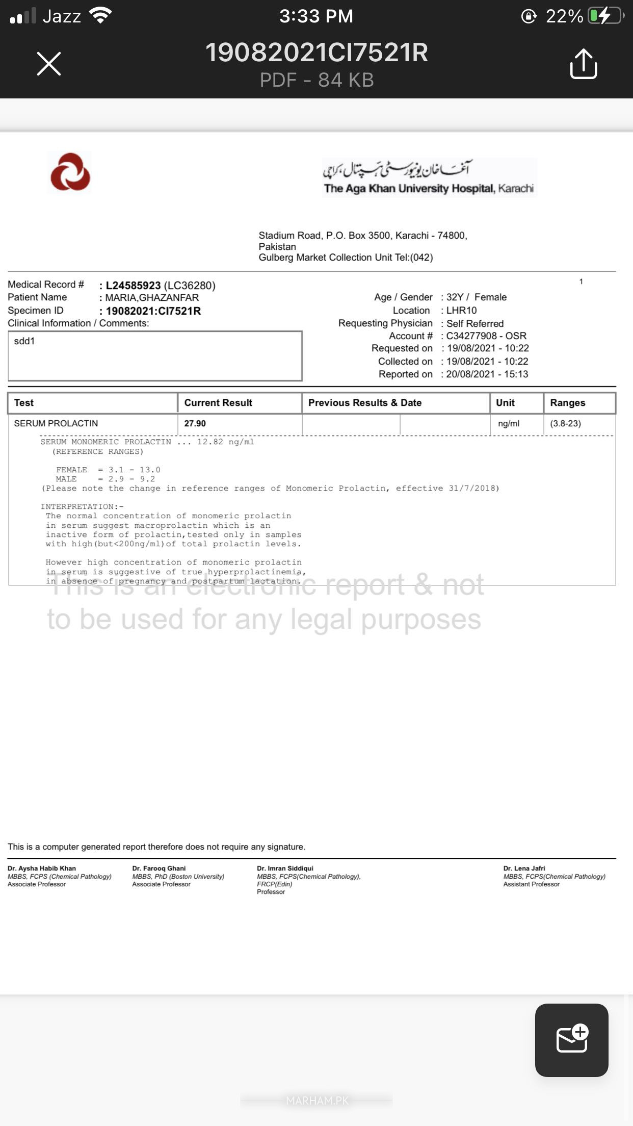 Aoa ... i m married, no kids. Not pregnant...I m having high prolactin level February sy... infact tab se hi check krwa rhi hun . Took brotin for 3wks mgr aus se koi farak nhi para . Kindly guide me to whom should i consult?? Latest report is attached below. Pls help