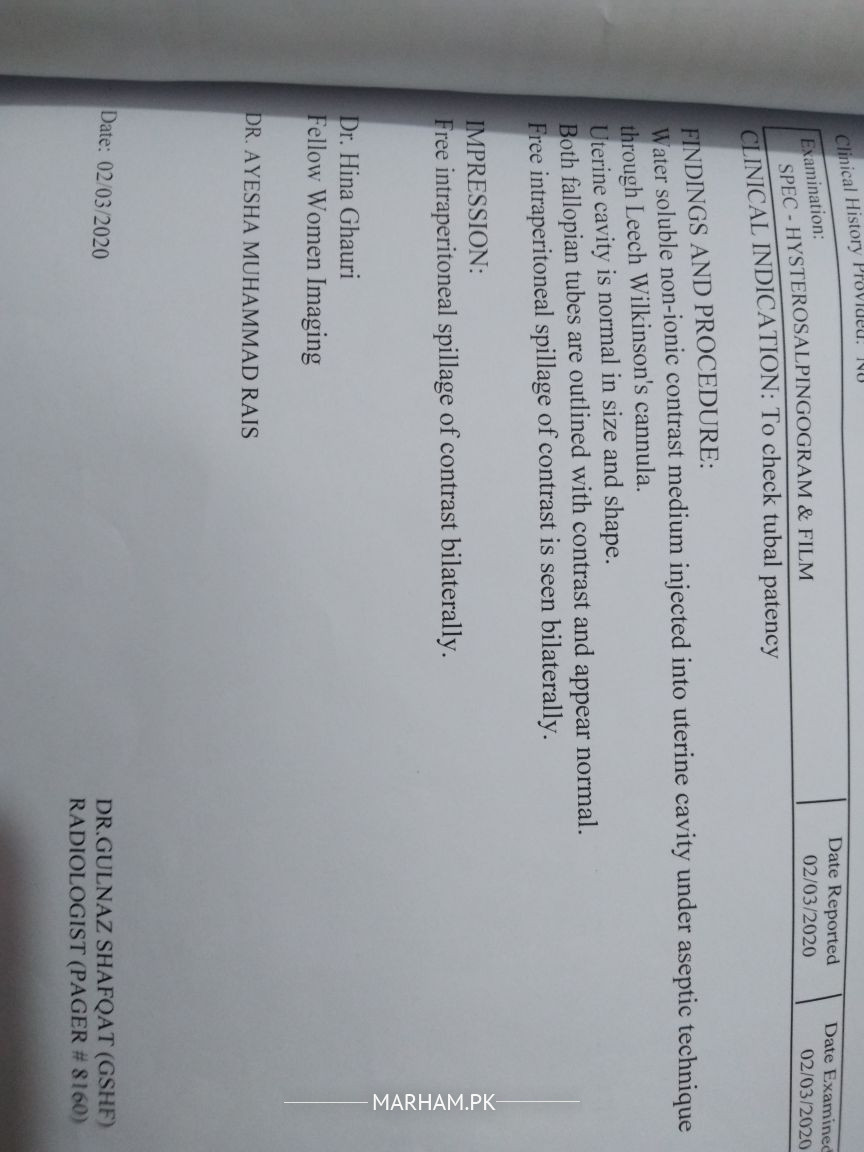 on both side spilled dye can b seen... its normal hsg. still if you want to take second opinion then report can be checked by sime radiologist... yahan tak bat laparoscopy ki hai it us best to diagnose so many problems responsible for not conceived till now.. including tubal patency