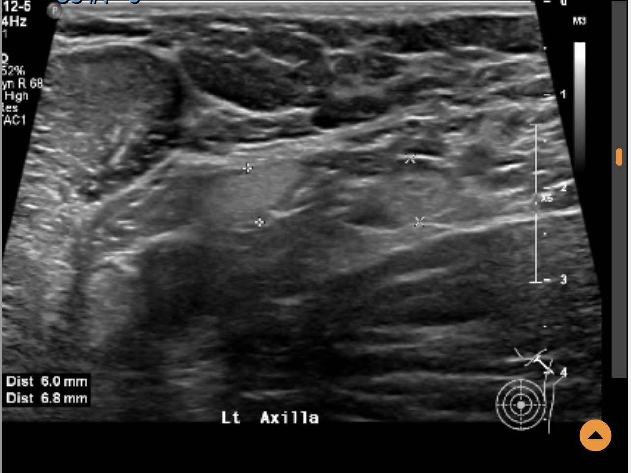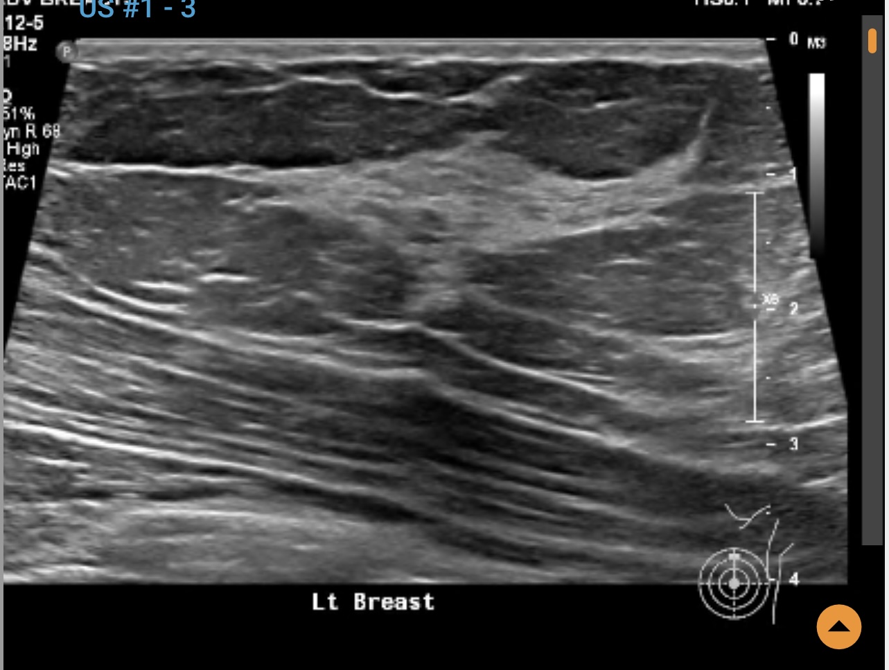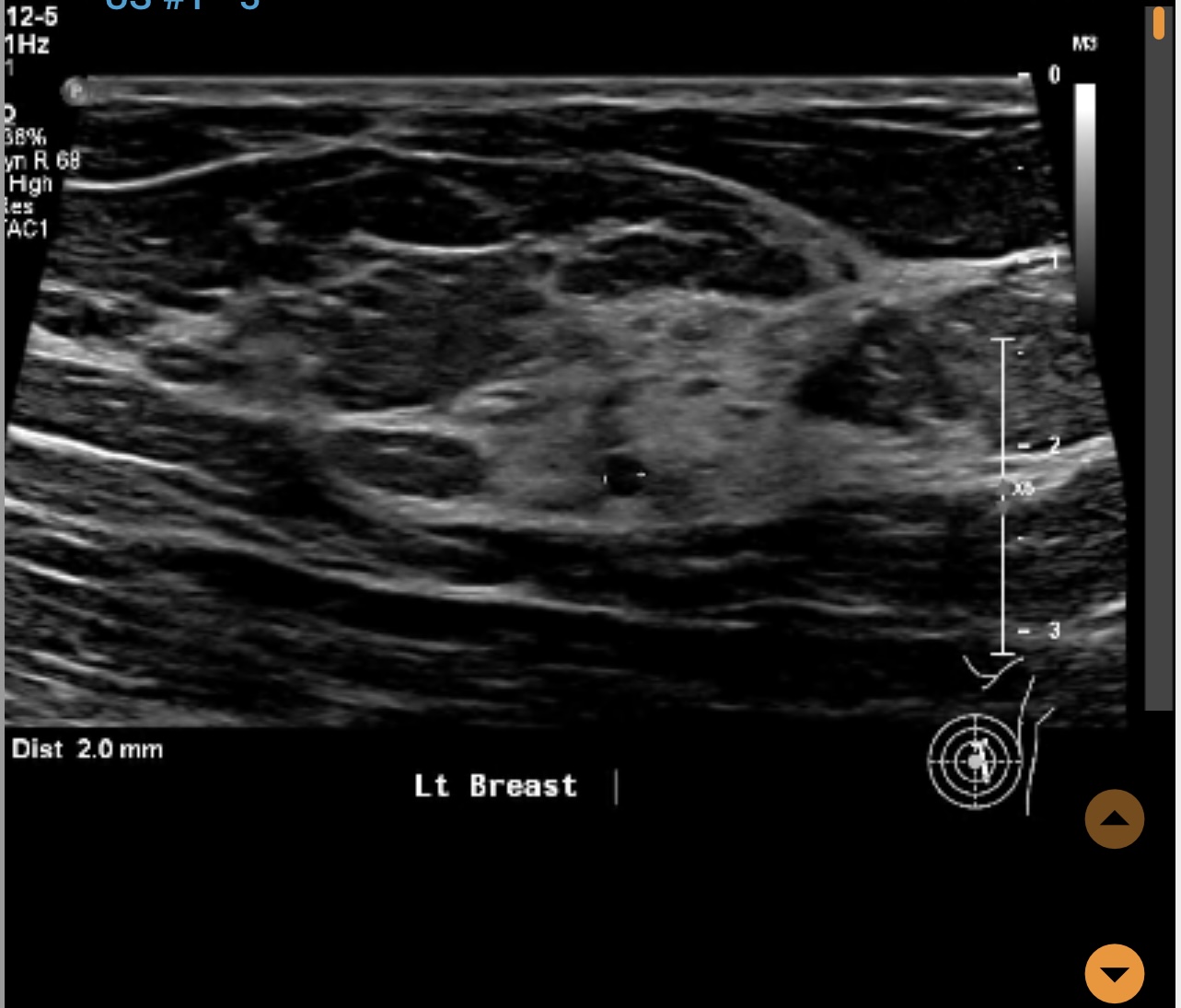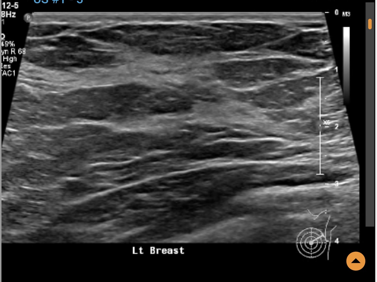 Left breast ultrasound report said no concerns. Symptoms - enlarged lymph nodes left breast, small cyst, changes in size and shape of left breast, dimples in lower left breast, pain in outer quadrant of left breast. Second opinion on ultrasound pics?