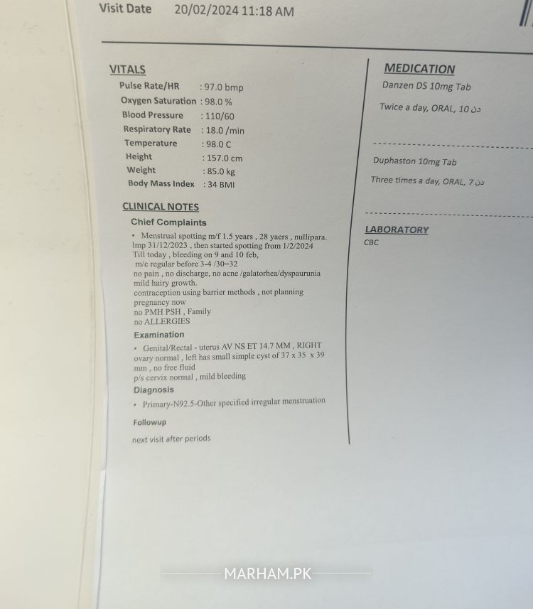 Aoa mj dates ka issue tha irregular thi spotting th blkl light 2 din bs bleeding hoi thri c os k baed phr spotting doc ko dkhya osny Kaha k Duphaston 7 din subha dophr sham ln or cyst h ovary m osky lye danzen tablet d or kaha k 7 din Duphaston lainy k baed apko bleeding ho g os k baed checkup k lye ayn per aj 9 din hai duphaston chorhy hoe pr bleeding nh h bs aj phr esy blkl light spotting h brown discharge h clot type.. Bleeding nh hai kindly sir guide krn kia kru dobra doc k pass jau w8 kru bleeding ka