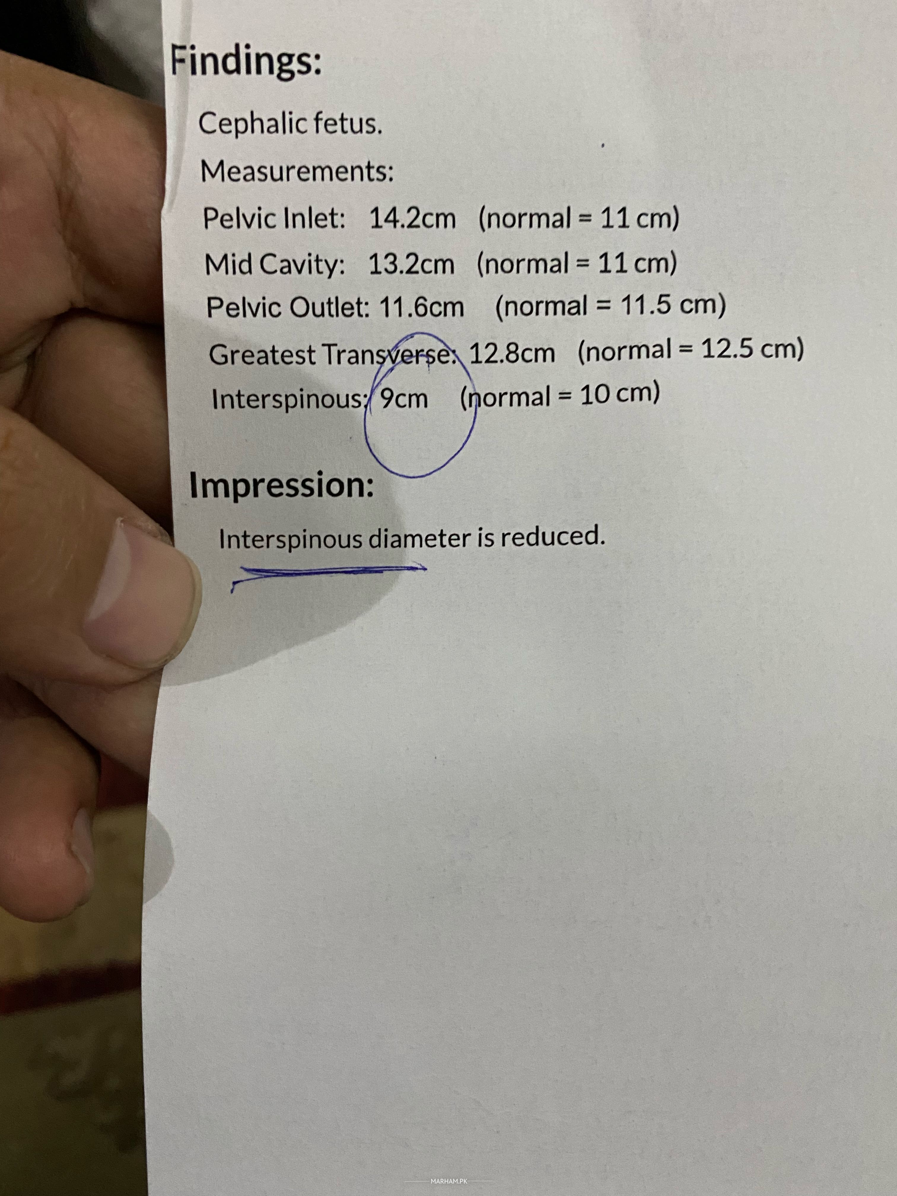 Interspinous diameter is less than normal in the report further evaluation can be done by gynaecologist checking CPD ( cephalo pelvic disproportion) . Book your appointment