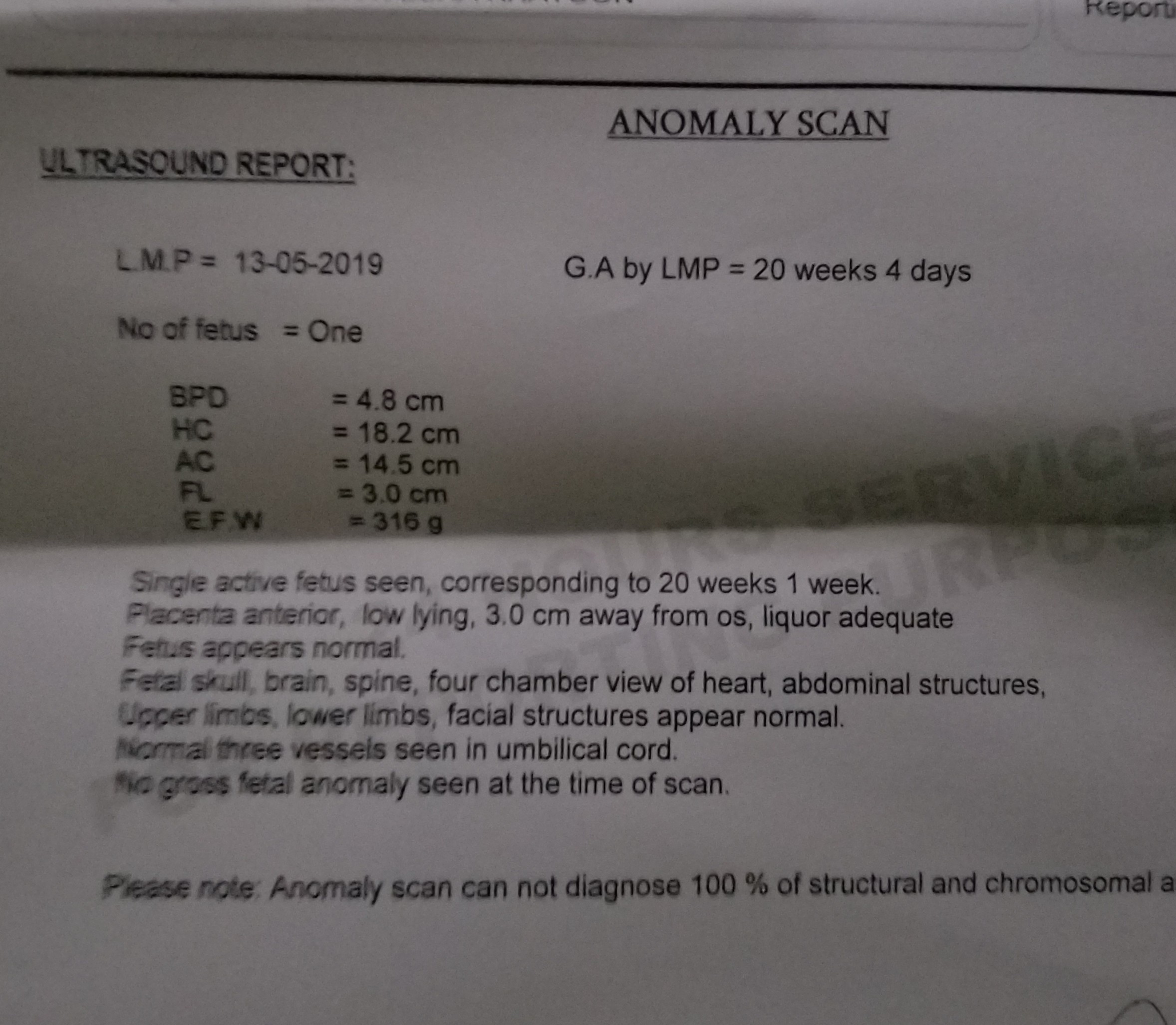 I got my anomly scan done today as my appointment with gyne is after 20 days and can't get it earlier I want to know if my report is having any complication. I'm worried to know if I need any extra precautions untill I get my self checked after 20days. As Im working lady doing office job of 7.5 hours with continue sitting. Kindly check and update if there is something I need to be worried about. Thank in advance