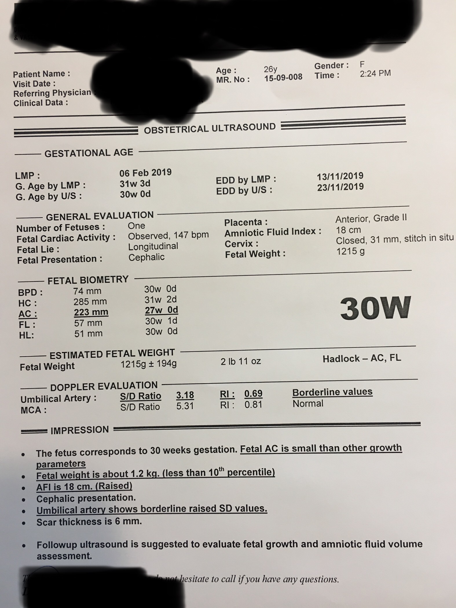 1- Umbilical Artery shows raised borderline SD values 2- AFI 18 cm at 30 weeks 3- Fetal weight is less than 10th percentile