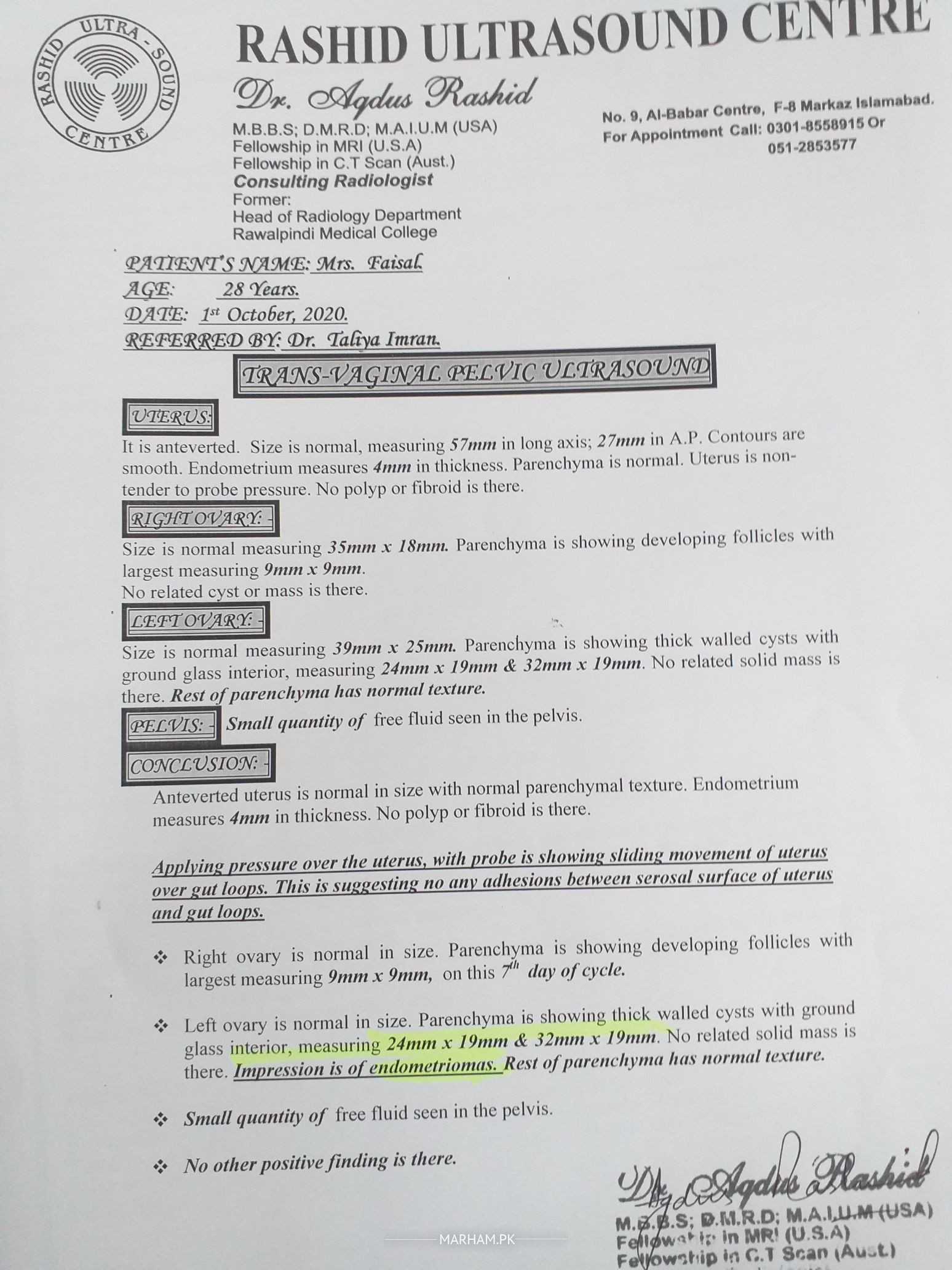 Tvs shows endometrioma ,its a ovarian cyst needs to b treated to concieve..