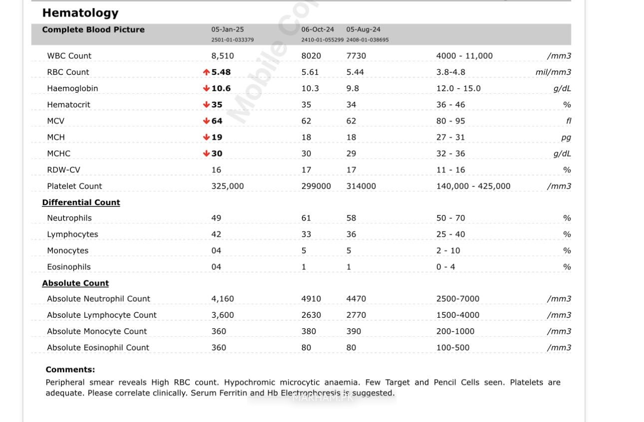 Here is the complete Peripheral Blood report from the past three follow ups, which indicates an increased RBC count. The patient is a 28-year-old married female with Thalassemia Minor. Could you provide potential reasons for the elevated RBC levels and suggest appropriate treatment options?