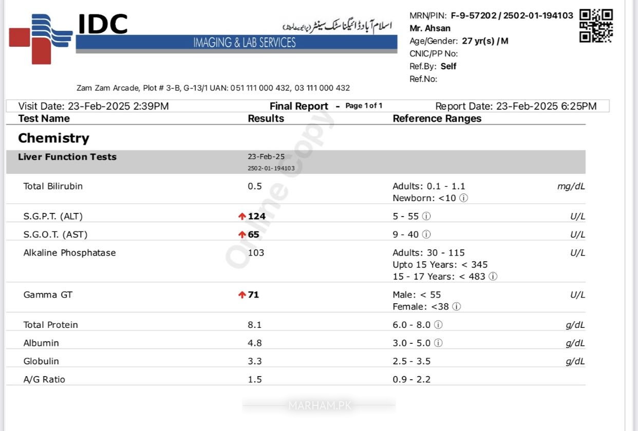 Salam, mene apni RFT, Hba1c or LFT report karwayi thi. Last time mera Hba1c 5.9 tha is baar 5.5 aya hai or RFT normal hai lekin LFT men ALT, AST or Gamma GT normal ranges se upper hai. Mene apni reports attach ki hain please check kar k bataen Do I have to worry about it? Or it can be fine by diet and exercise?