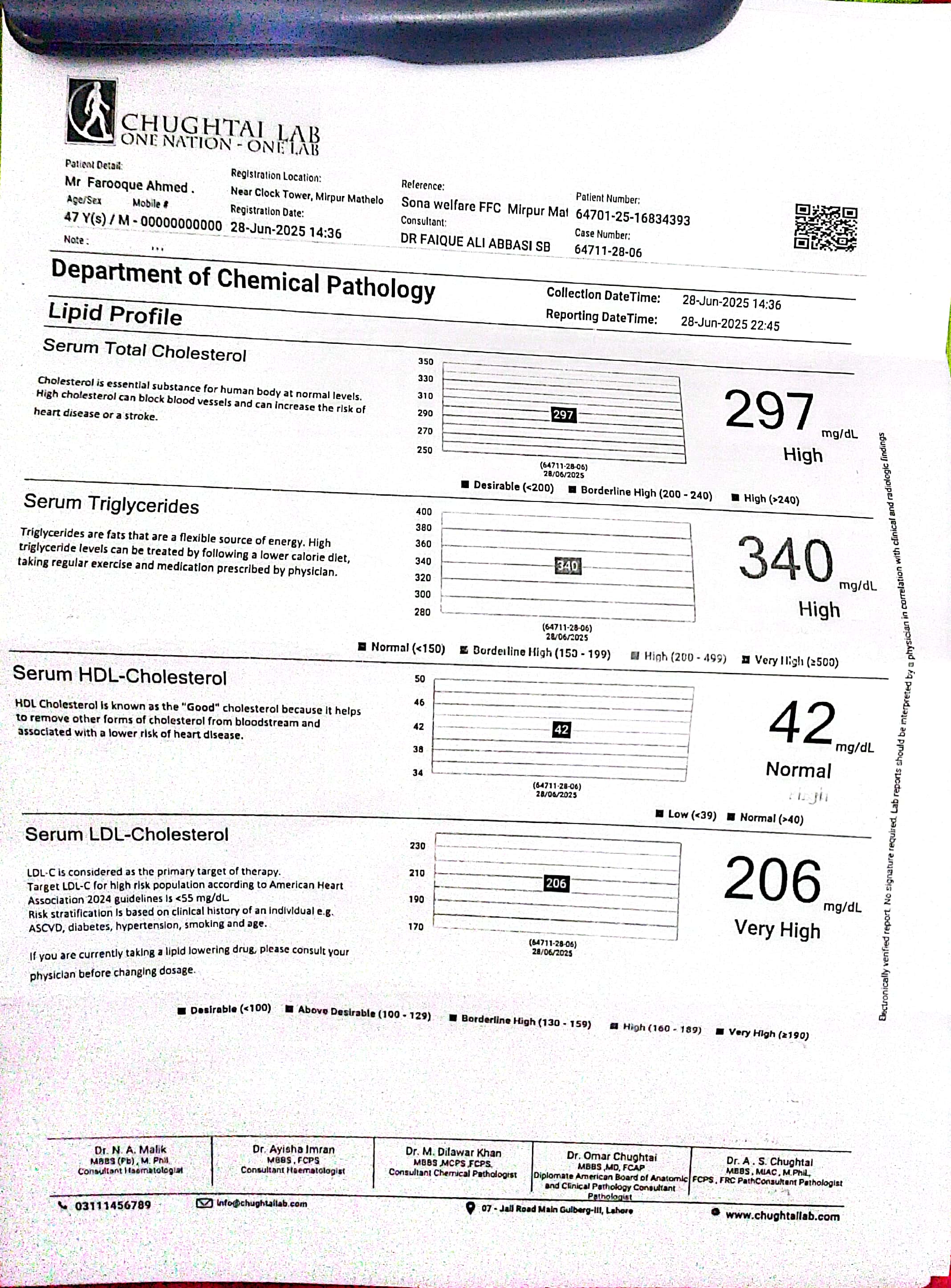 he is having his lipid profile very very much derranged۔۔۔ he is at a high risk of getting its complications۔۔۔ that can be fatal۔۔۔ visit my clinic for further management please۔۔