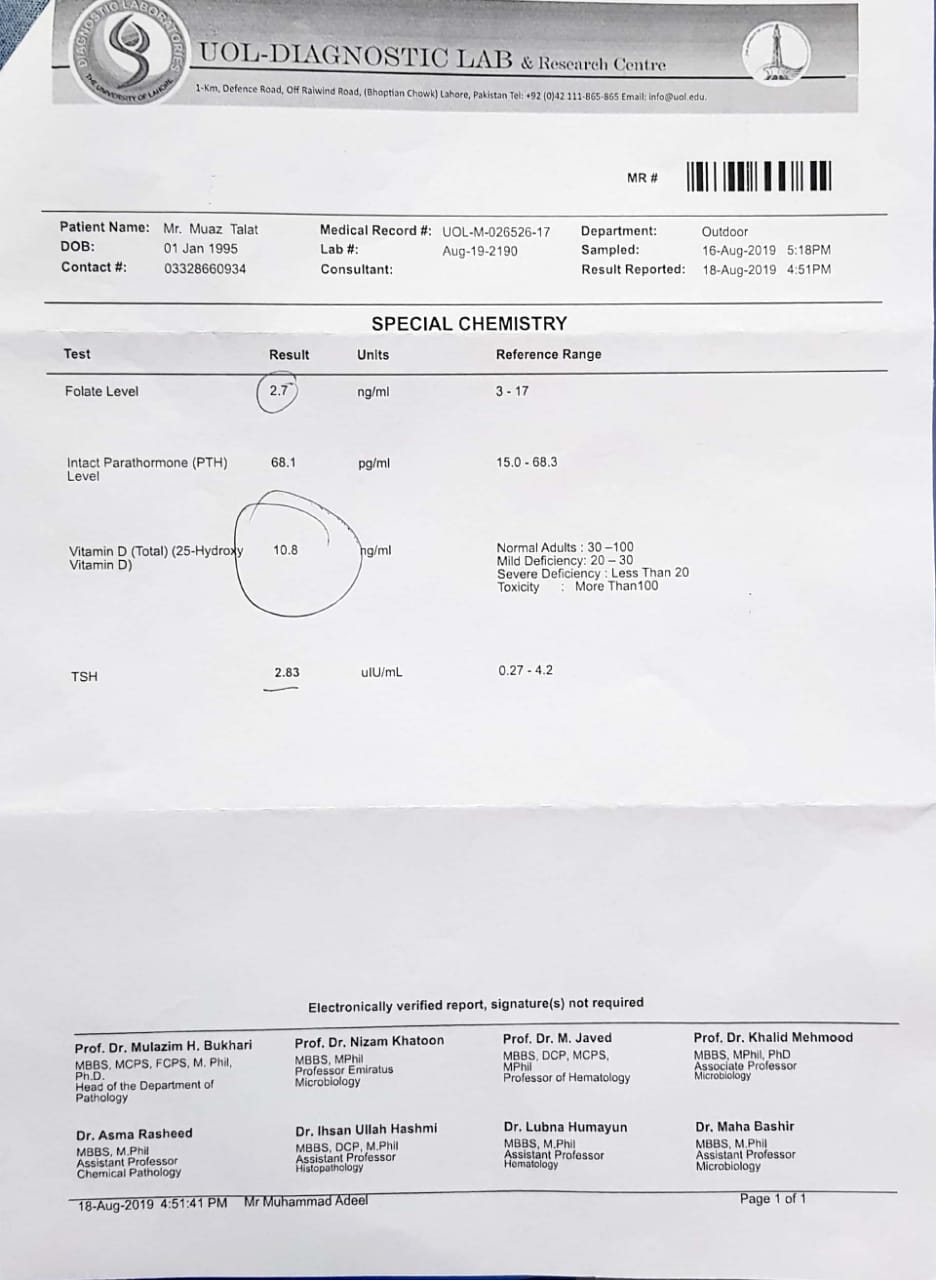 I’ve been suffering from limb weakness, pain and muscle twitching. I was advised FBS and TSH which are normal. Other vitamin tests are attached herewith which show Vit D deficiency. Kindly advise diagnosis/plan
