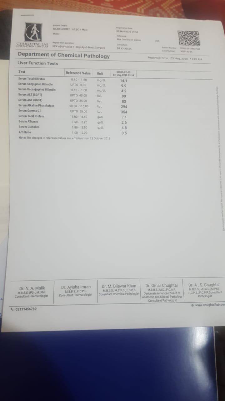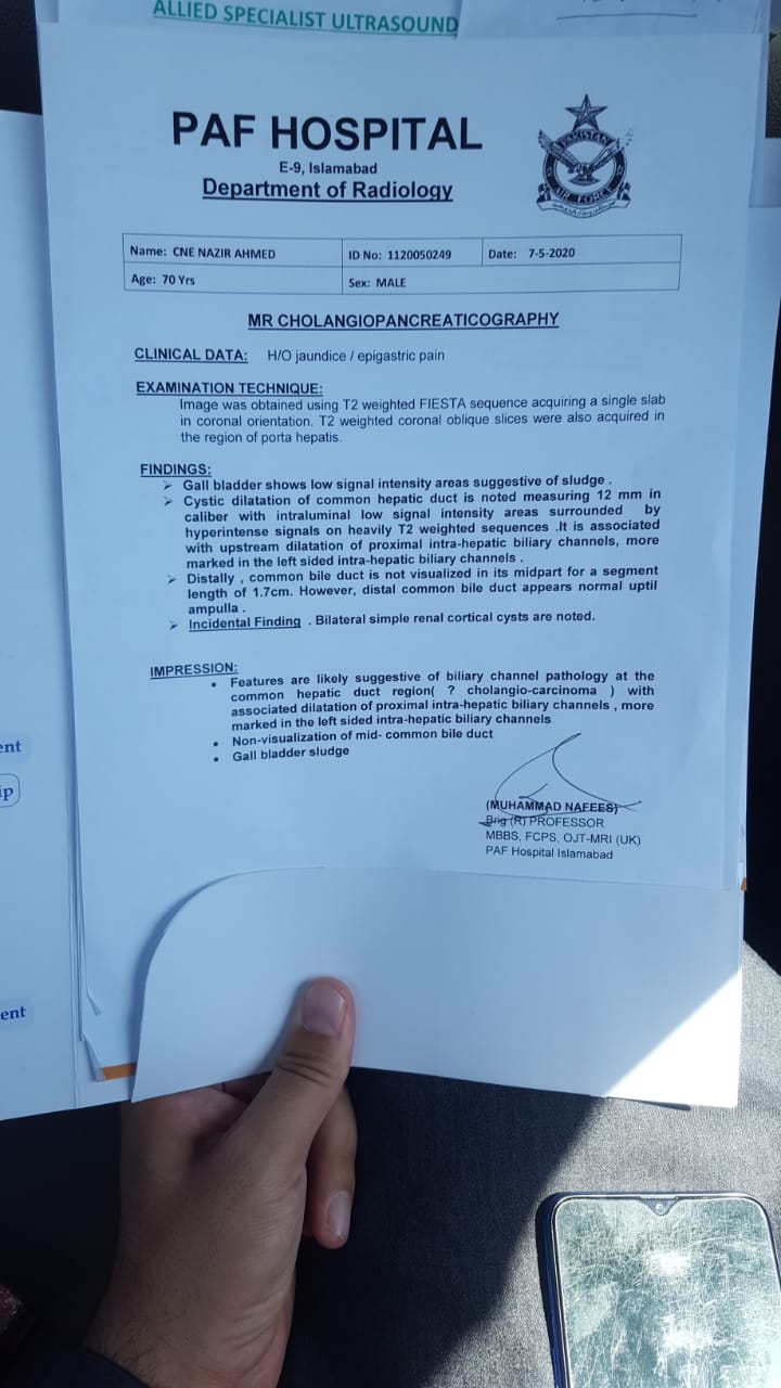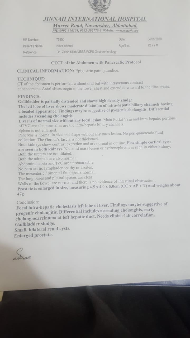 AoA , the most common cause of obstructive jaundice in old patients is mostly malignant pathology . From the reports you shared it looks like cholangiocarcinoma . I think that you should have his ERCP done and if required allow stenting by the gastroenterologist. It will be beneficial not only for relieving his symptoms but diagnosing the disease as well . Dr Amjad Salamat is a good option but you should get over with it ASAP. Though the prognosis does not appear to be good but hope is what helps us to keep on going . Give a lot of Sadqa and pray to Allah Almighty for easing his symptoms