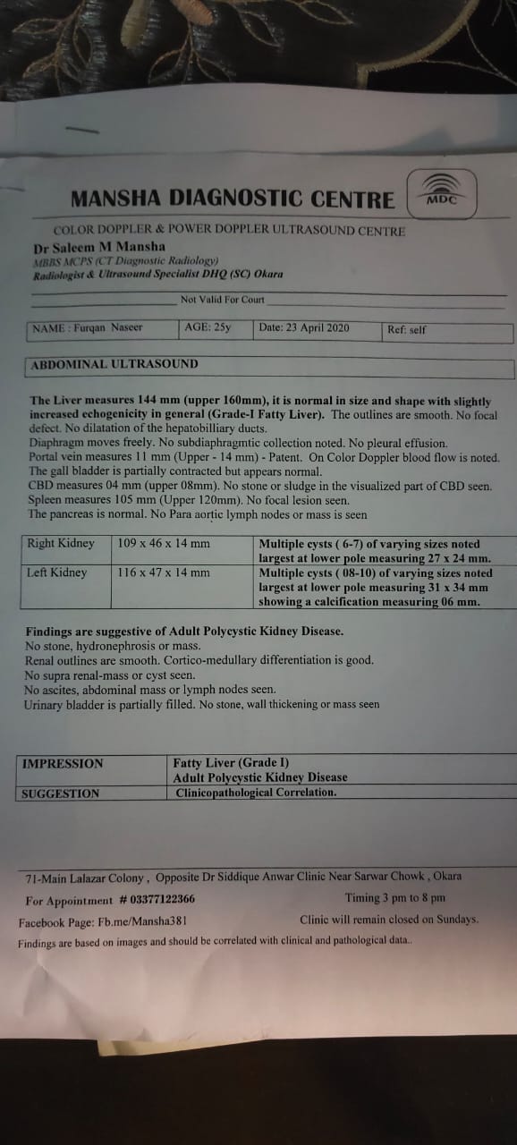 It turns out some issues in my liver and along with that, I got to know that I have cysts in both kidney. The doctor said that it's not that serious and the cyst is natural so we can't do much. Having cyst is genetic and elder sister has as well and she is doing the medication for the last 3/4 months.