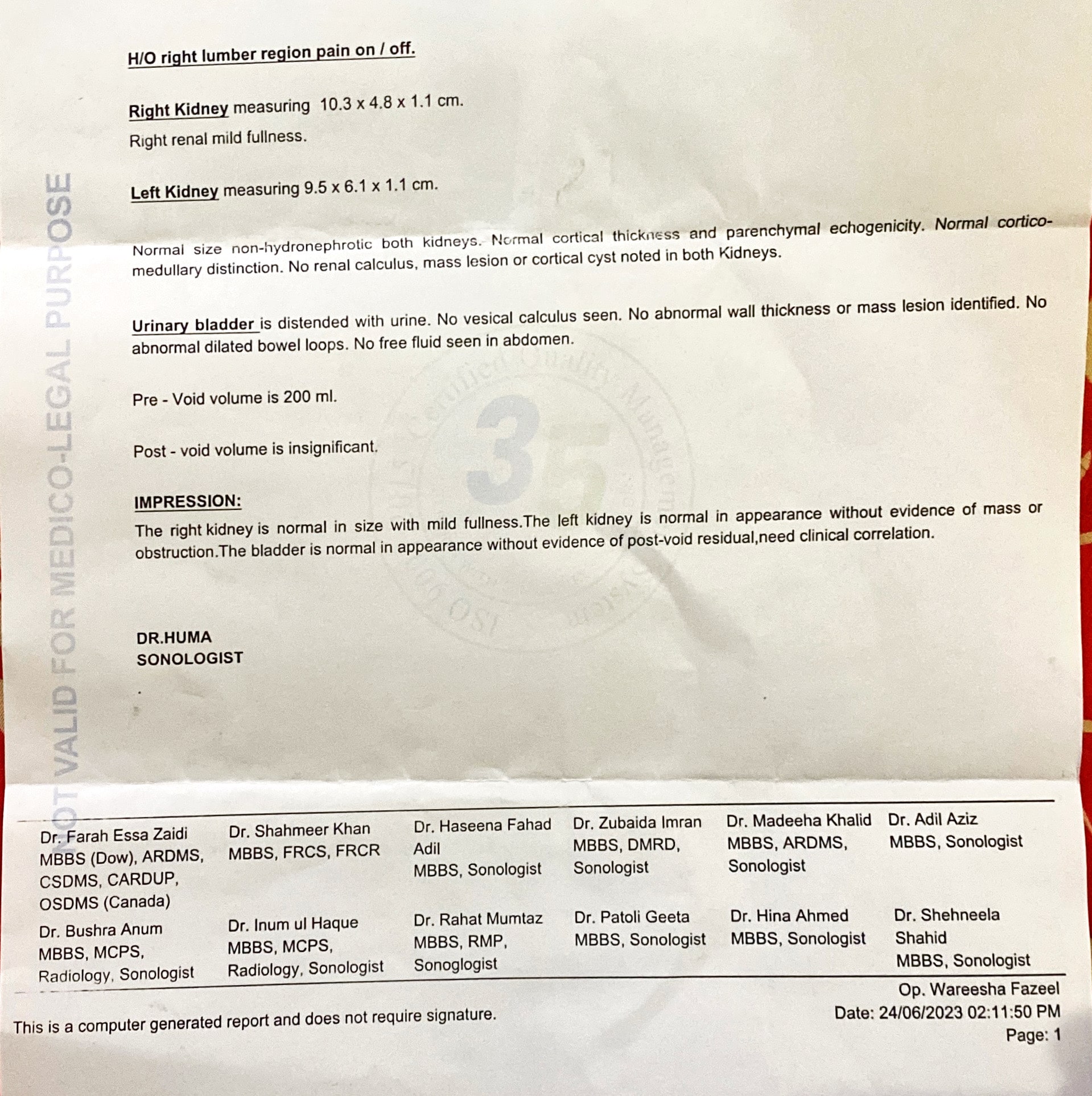 i had mild pain in my right kidney for past few days so i went for an ultrasound, along with a urine DR test as well, it shows mild fullness in the right kidney, i have attached the reports as well, please recommend the necessary medicines or procedures to be taken,