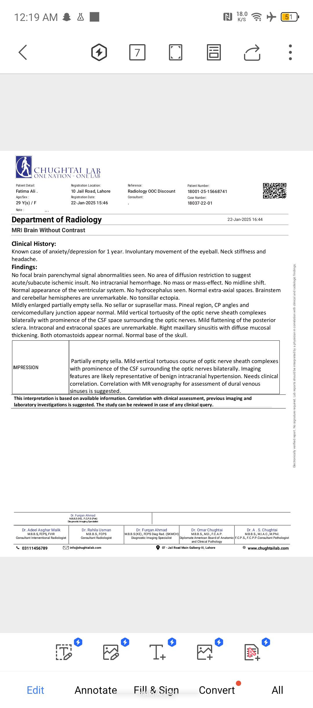 your headache is due to partial empty sella( most common finding nowadays) or due to increase CSF. pressure slso effecting your eye sight (you should immediately xinsult ya neurophyscian