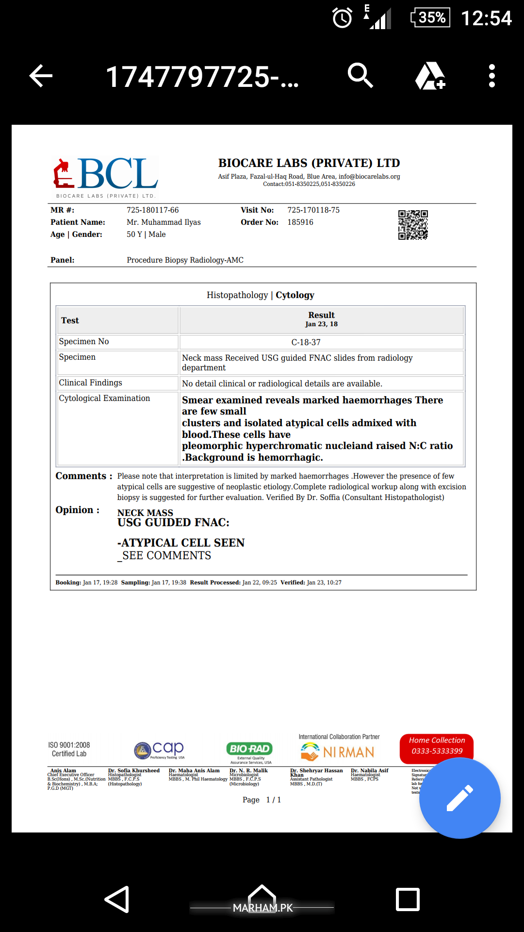 this is biopsy report of his neck. neurological doctor said faisla palsy is because of a cyst in neck. attached is the report of Neck biopsy. please advise.