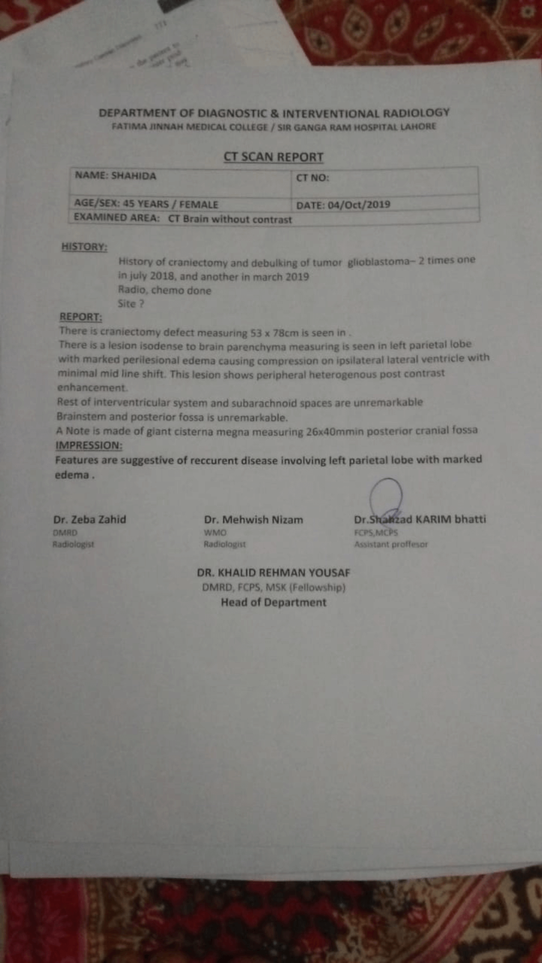 i am very sorry to hear that. operate or not operate depends on general condition of patient, extent of tumour. you have shared only CT scan. please share images of MRI with and without IV contrast on whats app. 042-32591427, . i practice in Faisalabad.