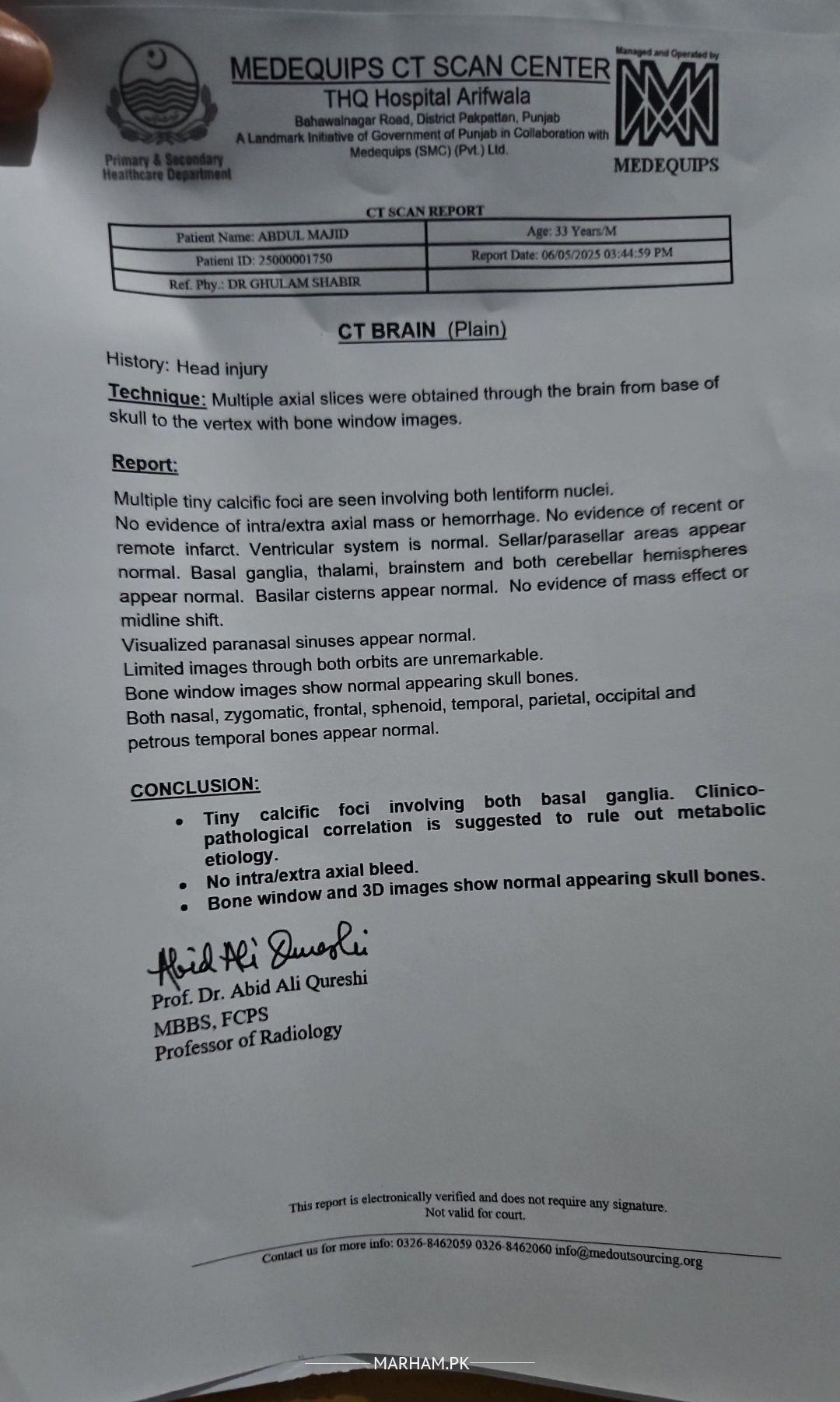 ur CT report is normal those Basal ganglia calcification or aging process ND some runs in family so not to worry about that on other hand ur symptoms show some metabolic abnormality for that u should run some blood tests ND thn we will decide for the further plan