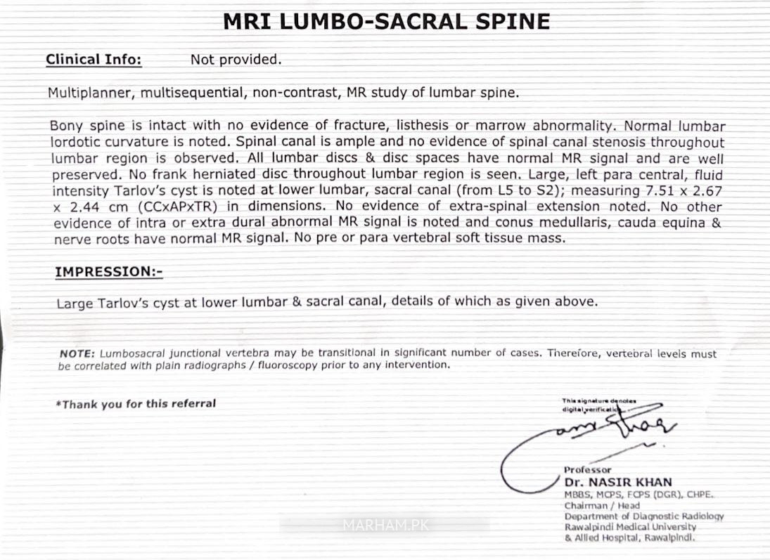 Tarloc cysts are usually found incidentally on MRIs and are usually asymptomatic. They do not need to be removed unless they are causing symptoms.
