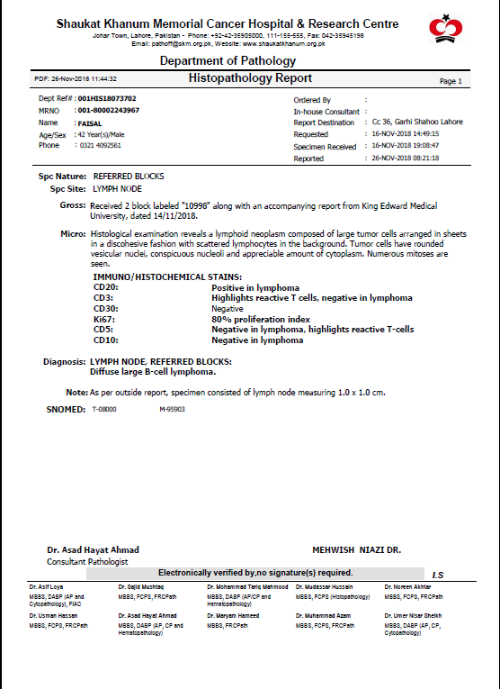 Salaam sir. According to the CT scan report it is stage 2, non Hodgkins lymphoma. Echo report is excellent. He needs R-CHOP chemotherapy. Good luck!