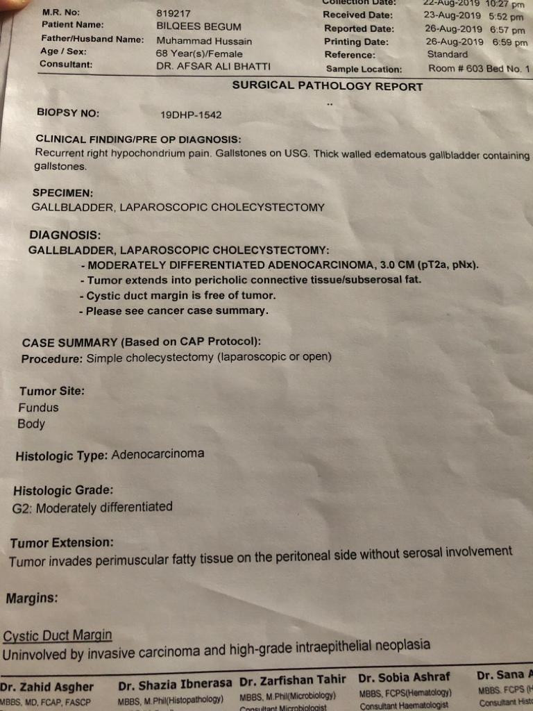 My mother recently went through Gallbladder Lap. Chole. And pathology report revealed Moderately Differentiated G2 Adenocarcinoma. Oncoligist further suggested few tests including PET CT Scan and the results are below. CA19.9------16.42 CA-125------16.9 CEA------1.49 PET SCAN findings revealed Metabolically active INTRA-thoracic lymph nodes are concerning for Metastatic disease. Hypermetabolic lymph node measures 11mm is observed in descending aorto-esopageal recess likely Metastatic. Now what should be next procedure? Is it curable. I am attaching the reports.