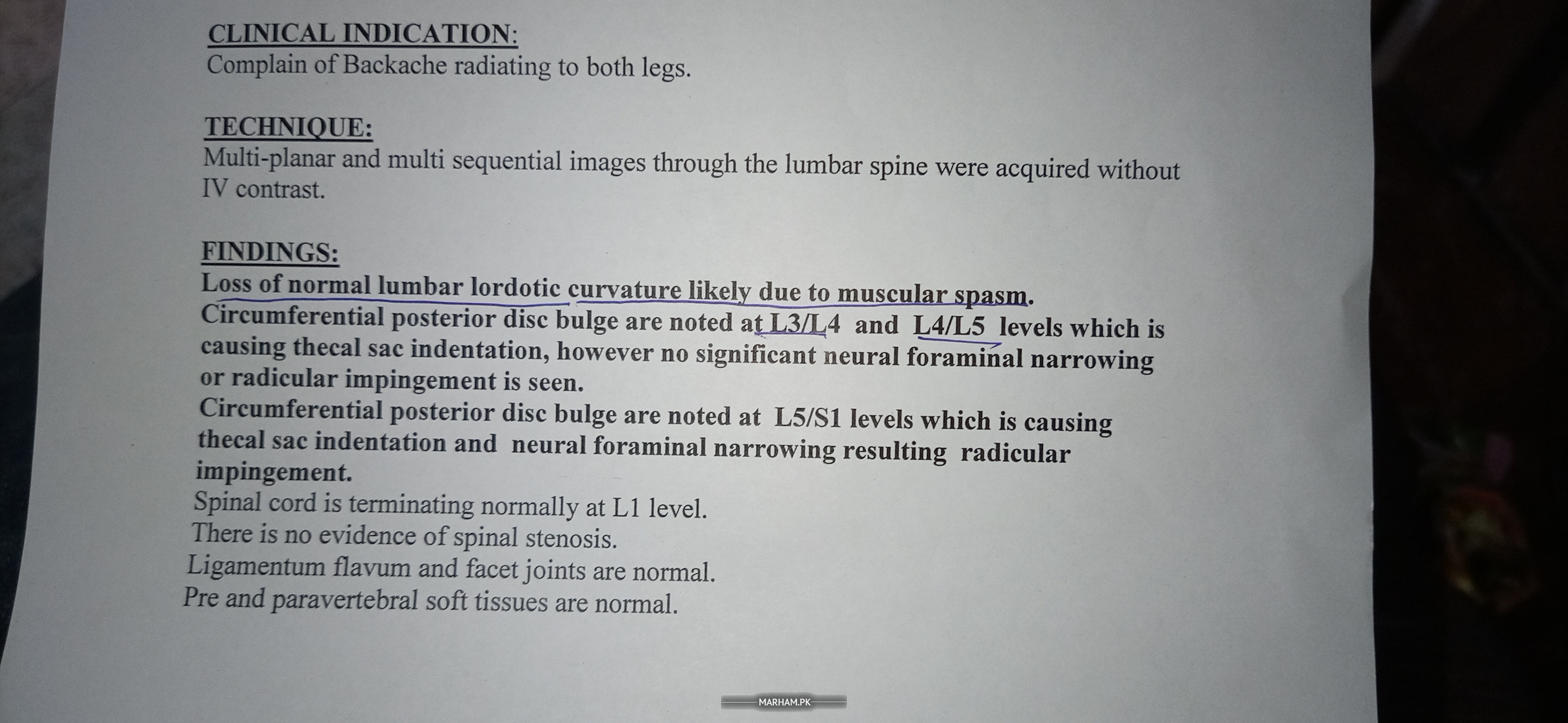 Aoa have u got any trauma? Mad kia pain legs ma jati ha. And any numbness in leg? Have u got any xray or mri if any send me pic will discuss more and final management of disc
