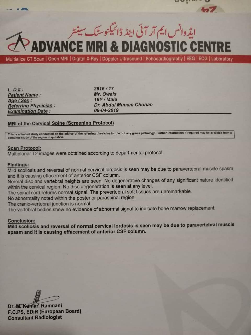 A cervical trauma seems to be the major culprit in this case. Need to fix atlas first, followed by scoliosis correction.