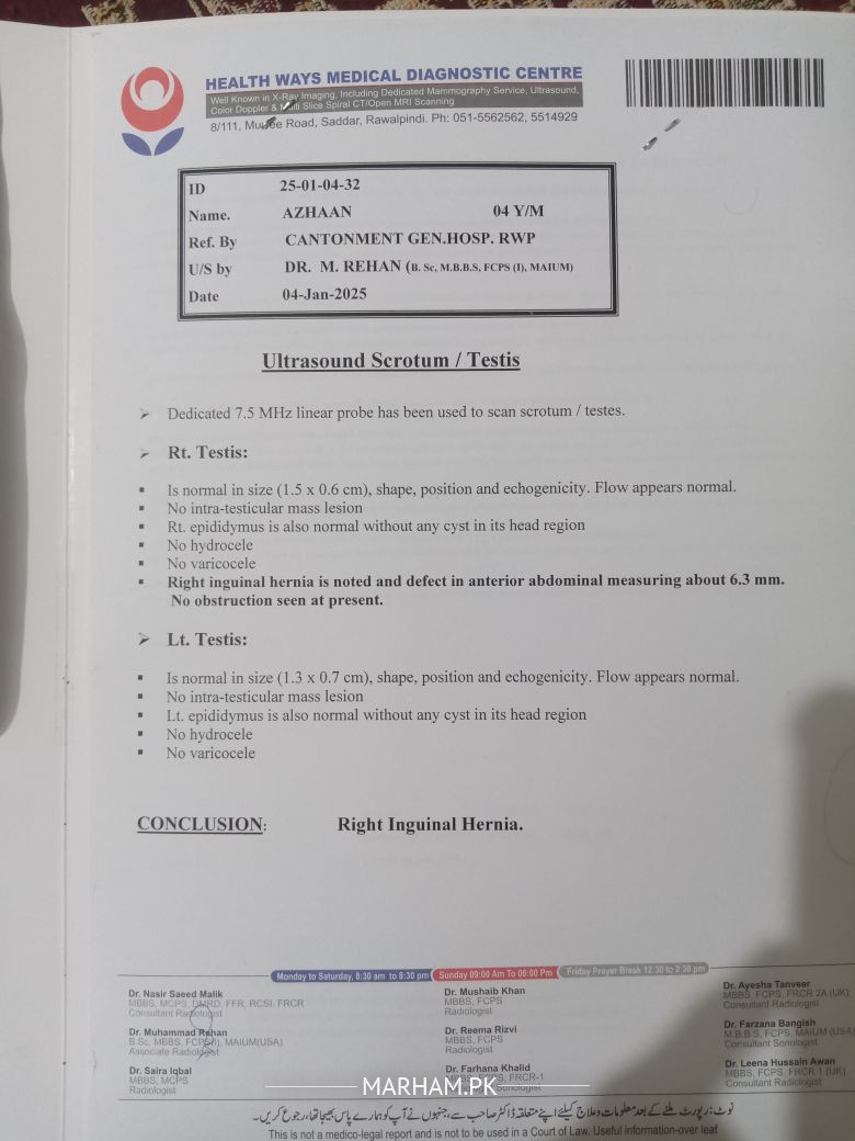 (Note: A brief history about the past) When My son was 1.5 months old at that time he got the same inguinal hernia issue and one of the pediatric surgeon of Military Hospital suggested operation in a week. but my heart was not satisfied after getting many other expert opinions I waited for him to be at least 3 months old. With the blessings of ALLAH ALMIGHTY he Healed by its own after 3 Months..