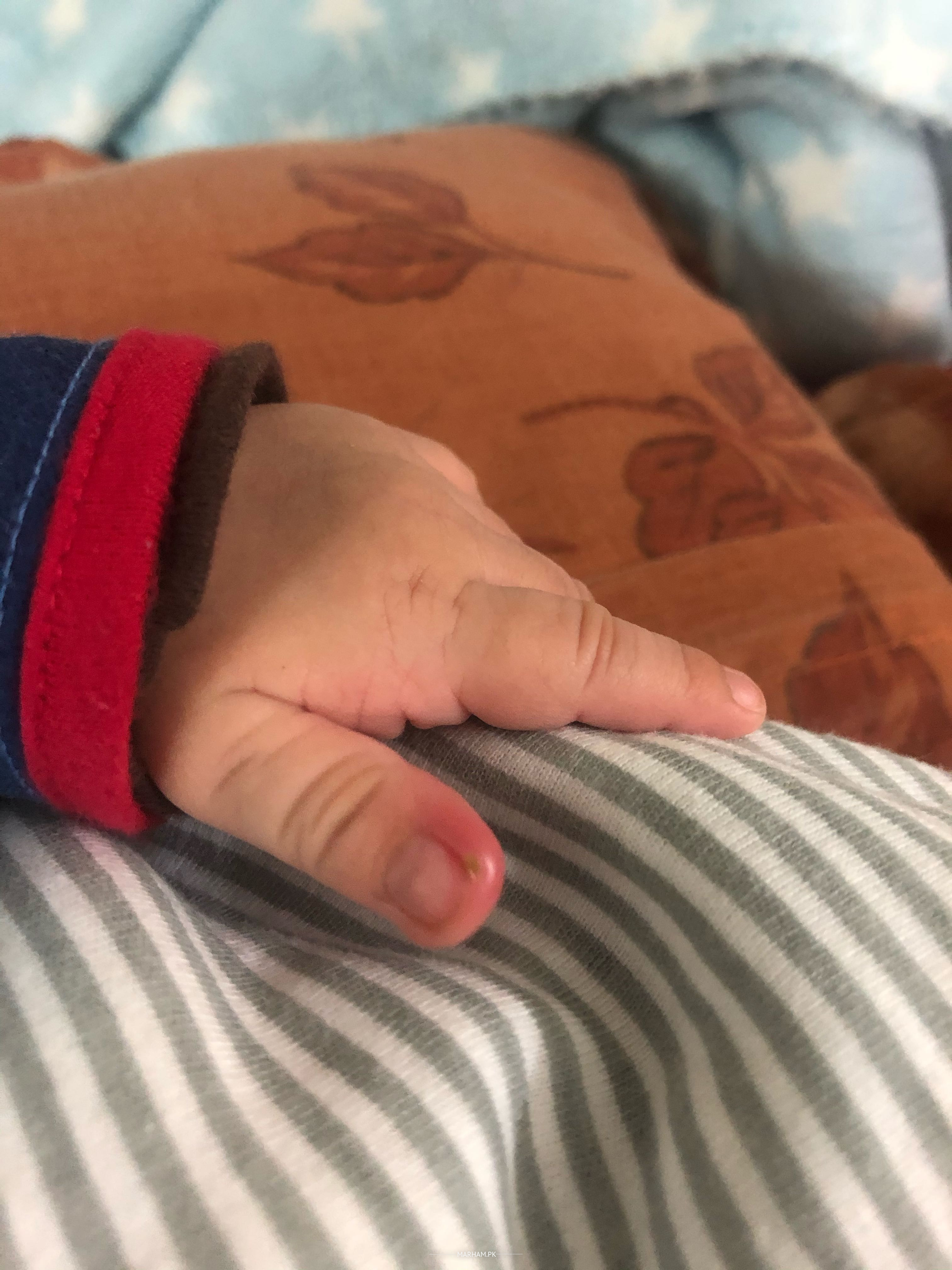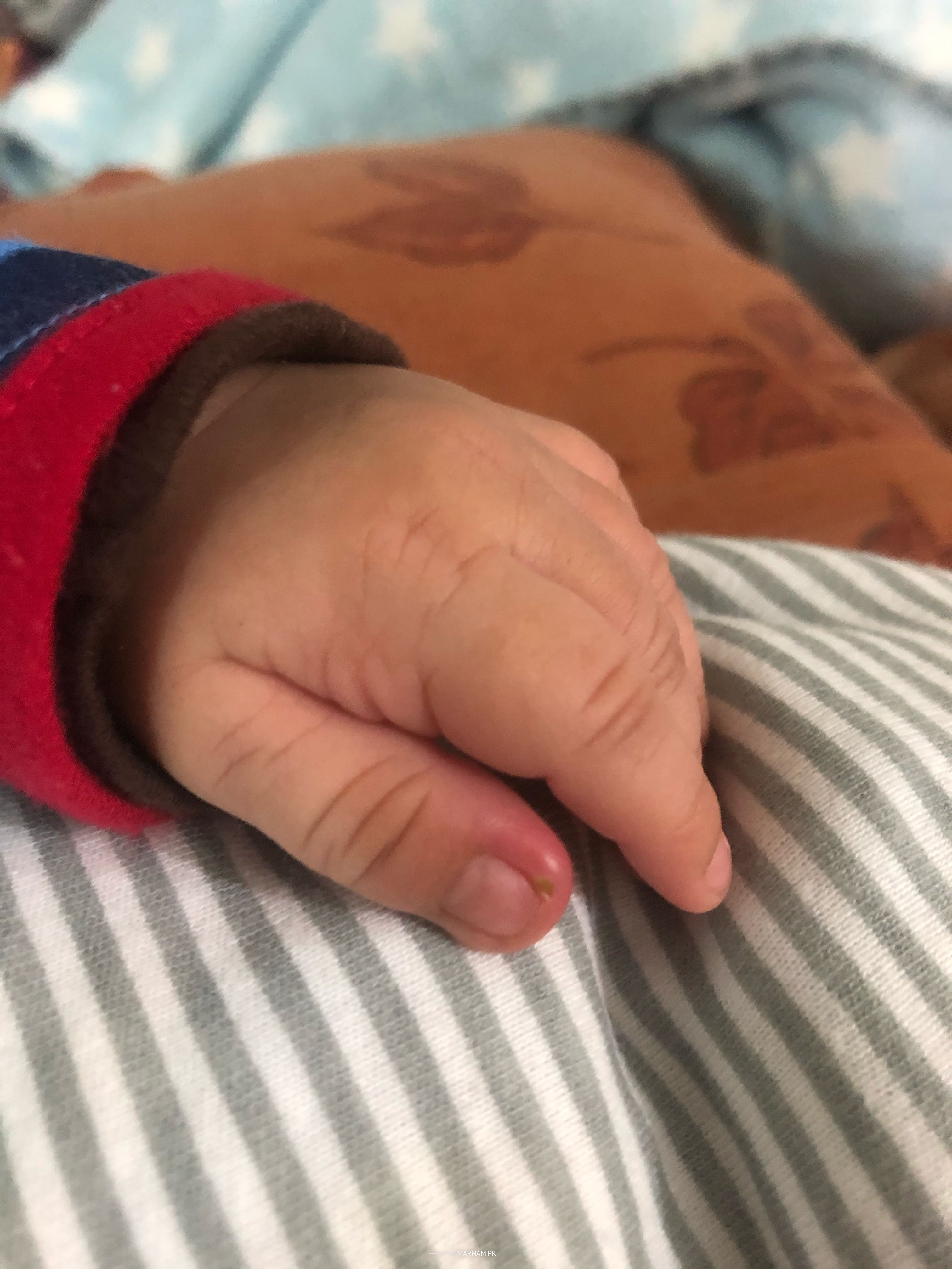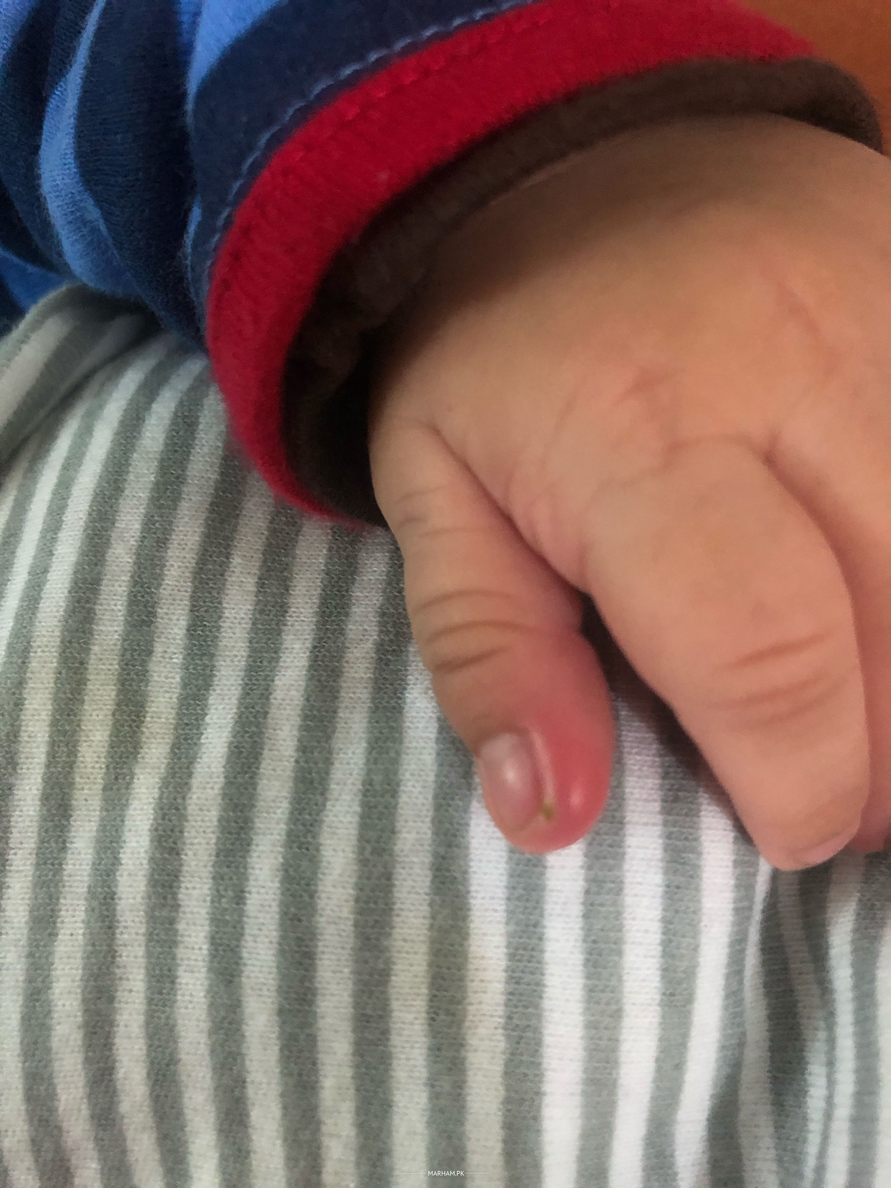This thumb along with two other fingers one month old baby’s hand is very red since two days. This thumb also has something green on it. Can any one help if it is a mosquito bite or something serious