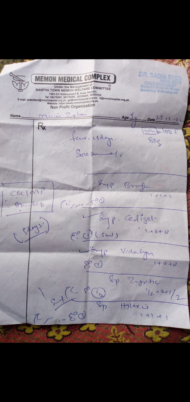As salam o alaikum ... Mera beta 17 months ka ha kuch din se bar bar fever hora ha dawa dete han utar jata ha lekin ziada hone ki waja se child k doctr ko dikhaya unhone anti biotic d detail me attched krra hu medicns ki 3 din hogyae ha dawa lete we lekin sirf rat ko fever hota ha 3 ya 4 baje wo b sirf sir or jism garam hota hat paon normal hote ha kia aesa normal ha q k gala buhat khrab ha kia anti biotic lete we is tarhan ni hona chaiye .. ? Next hum kia kre na ye normal h ??