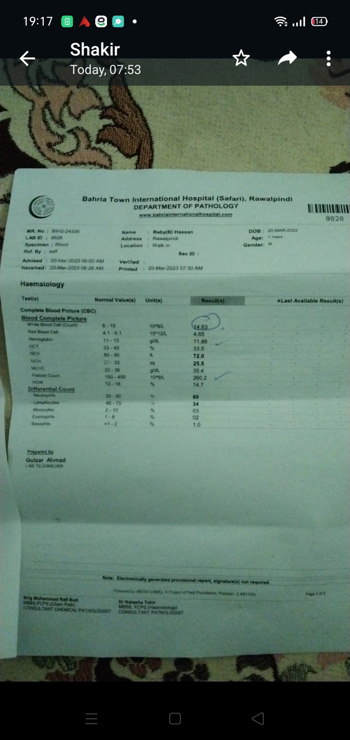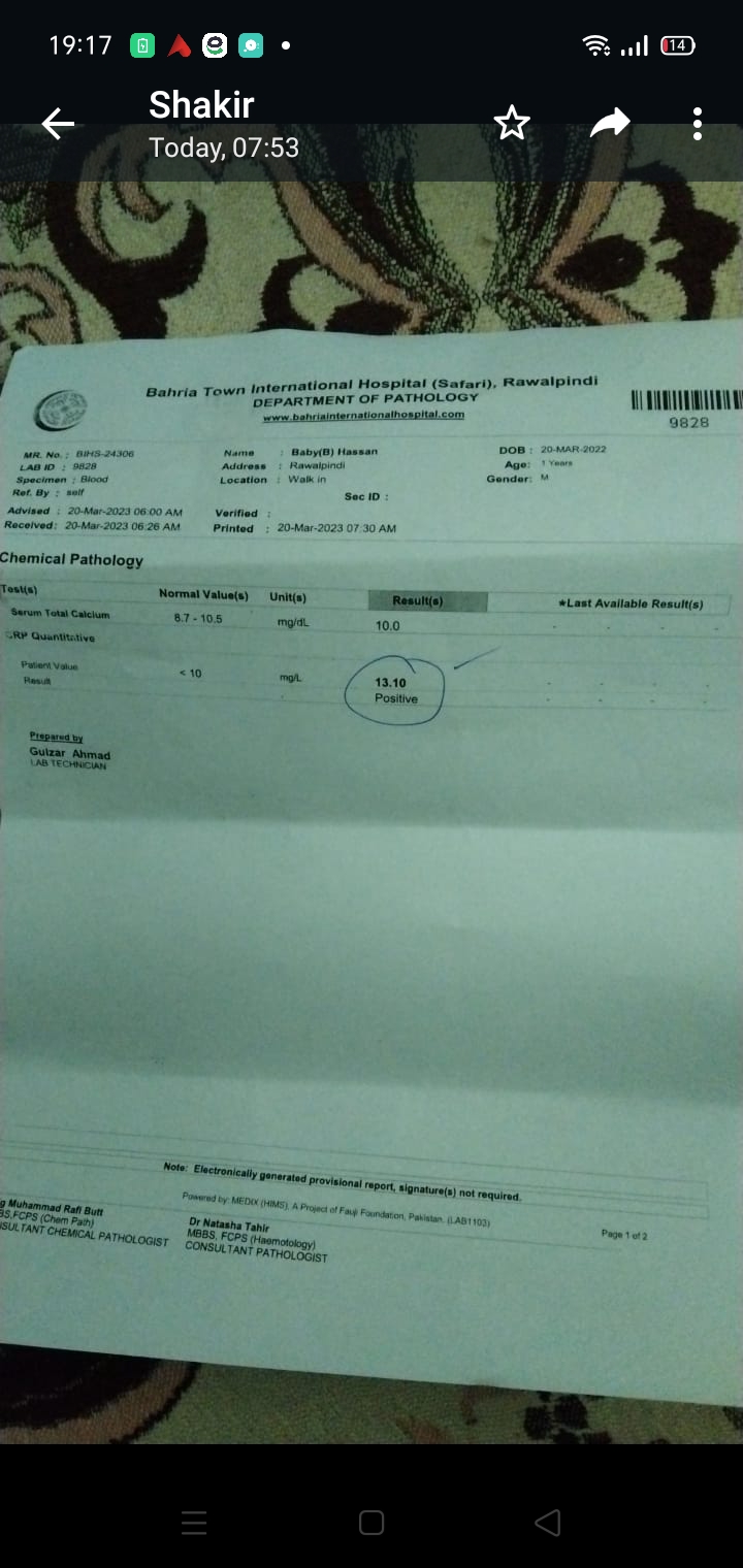 Aslam o alaikum Please please its urgent guide krn k baby ko kis type k doctor ko check krwaen in Rawalpindi bachy ko emergency safari mn b ly k gy hn very serious condition sans ruk gyi thi purple ho gya tha moh sy sans di to wapis ayi Ghar mn 10 months ka hy just fever flu hy baby ko but usko 5 bjy subha attack sa hua jis sy uski halat khrab ho gyi doctors ny emergency mn check Kia to yah reports hn please koe doctor ALLAH k lye please dekh k btao mery bachy ko kidr ly k jaon k yah thk ho jye Quaid e azam hospital b ly k gy unko vein hi ni mili baby ki reports dekh k btaen kya condition hy please