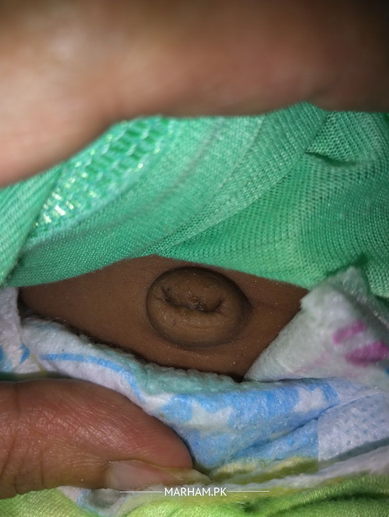 my daughter was born 25 days ago. i can see a pinch of water inside her navel. just wanted to ask if it is normal or dangerous. i also touched her navel to see if it hurts her, but she was calm. please guide I'm attaching the pic.