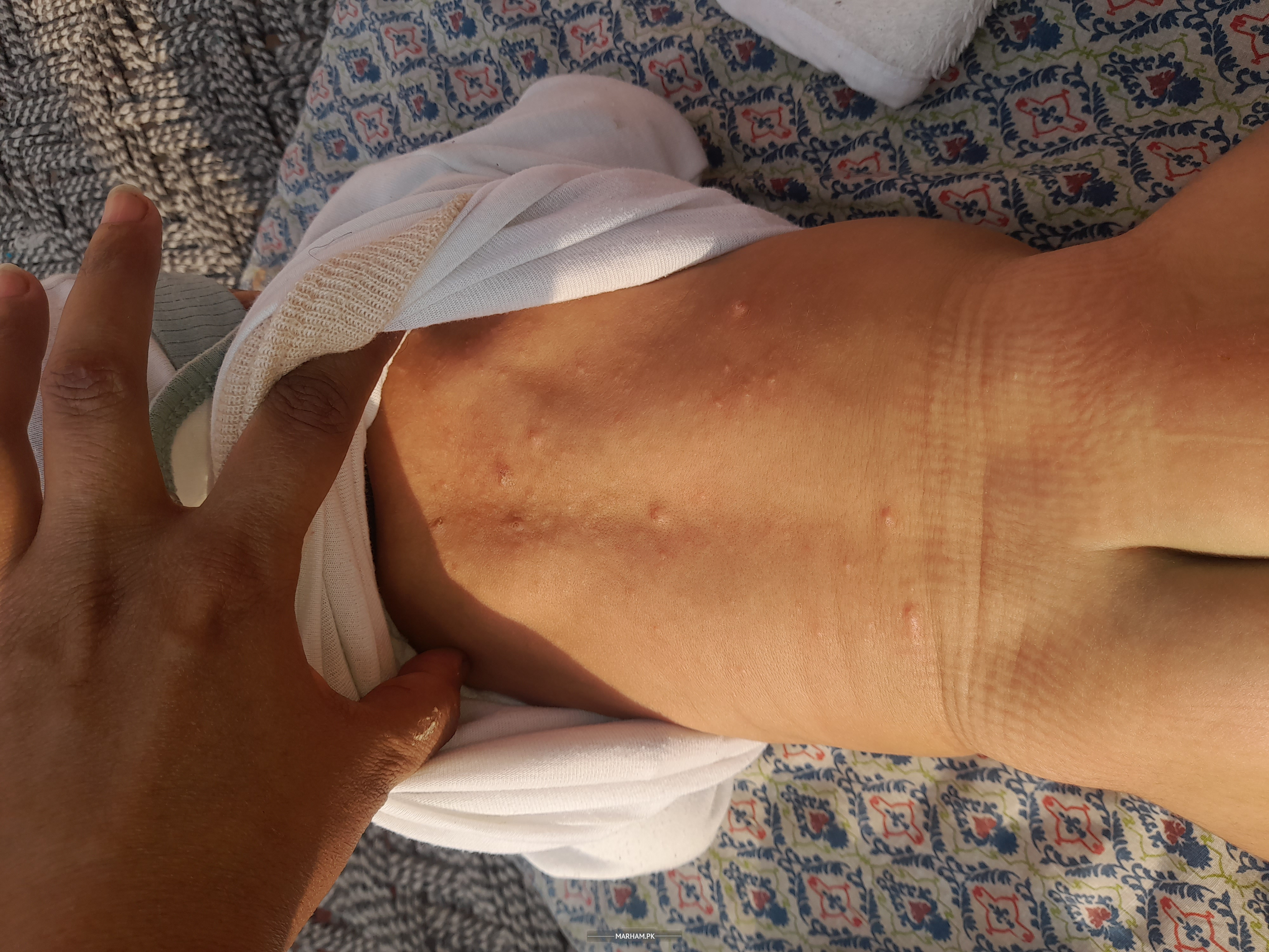 mery baity ko kafi din say body par boht ajeeb say Danny ban rahy hain pata nai yeh kaya nikal raha hai age is ki 3 months hai..cahly jayse dany hain pani waly or green colour ki potiya kar raha hai usi din say...