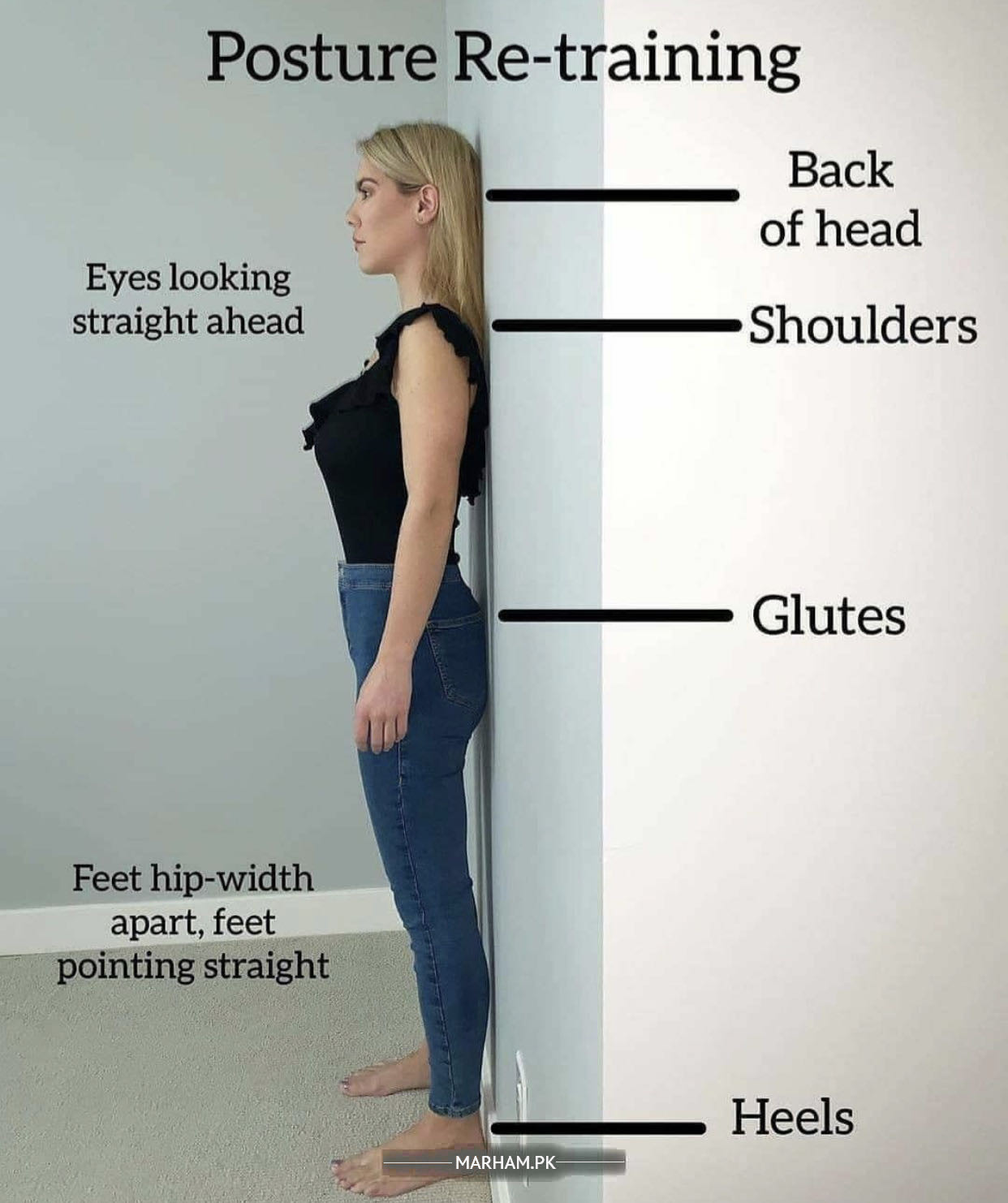 Stand with your back straight against the wall. And lie down on your stomach for postural correction. And for further assistance book an appointment with a physical therapist.
