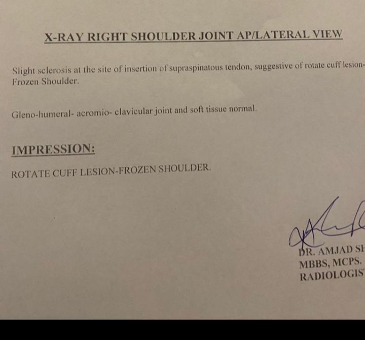 I have pain in my right shoulder from the last 6 months. Some say its cervical pain and others say its frozen shoulder. I have eaten medicines for painkiller but no improvement and the pain is worst at night I have hypothryodism as well. Moreover, the shoulder is very stiff yesterday i felt like something was moving inside. Please recommend me which xray should i do.