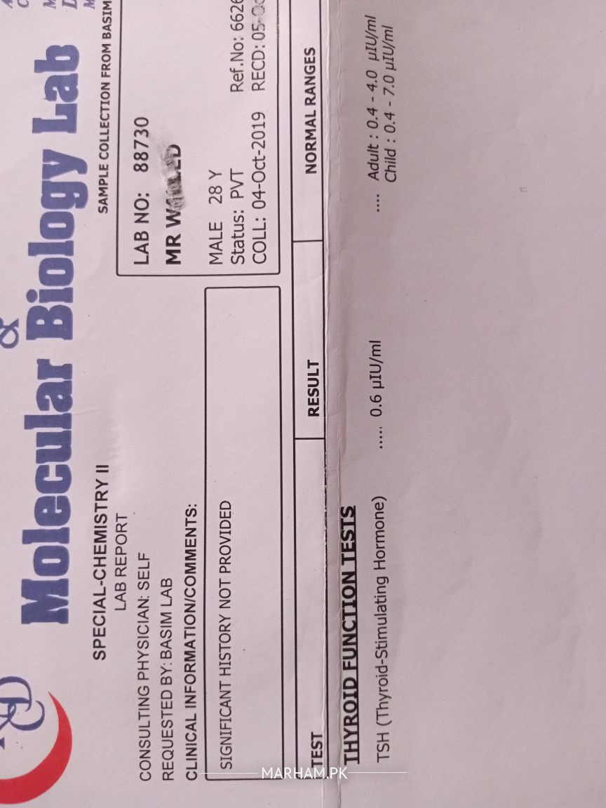 TSH ka test October 2019 mai hua ha. Jo normal ha lekin abhi k liay gayr mauzun ha.
