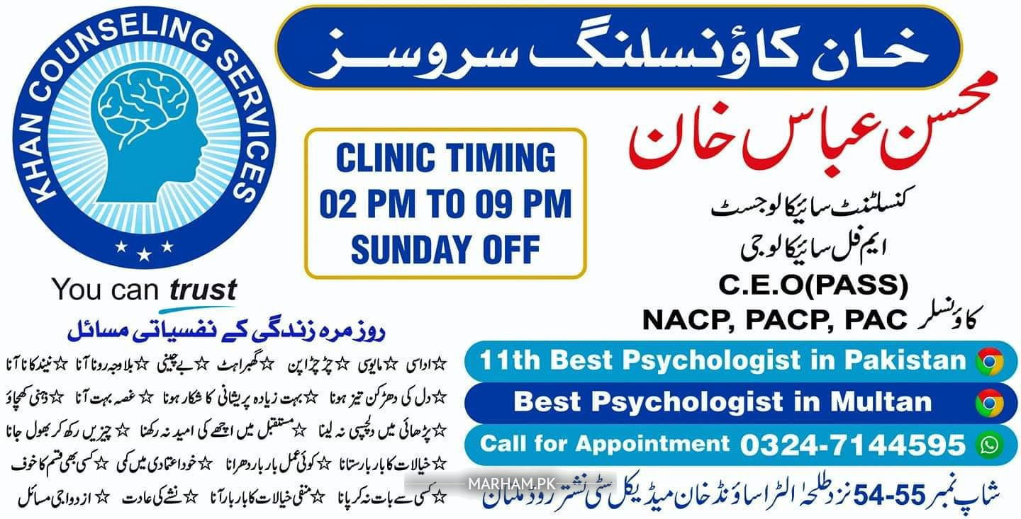 you can contact me in multan i am handling all kinds of psychological issues in females and male from 2016