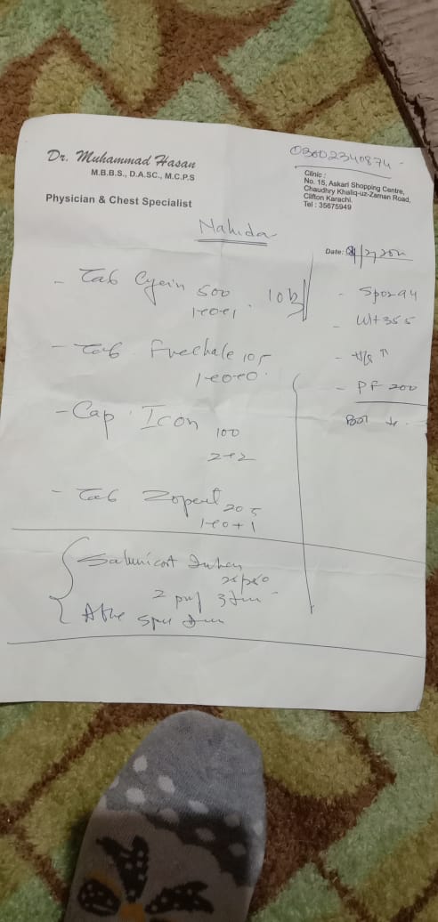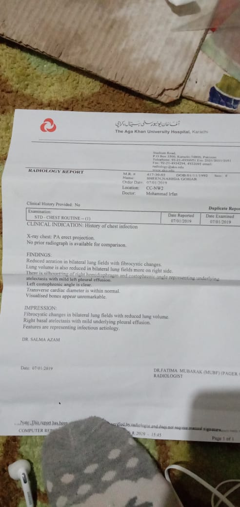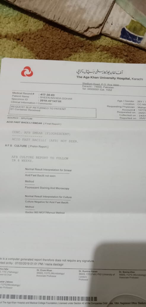 She is having the problem for almost 7 months. At start she took TB medications for 6 months still taking but after checking from AKU it was not TB. Now she is taking ICON 100mg for almost 40 days but no improvemnt her weight is not getting up she is feeling breathing issues really worried. Today I checked her from shifa hospital Islamabad doctor said no fungal infection and changed the prescription. Please need sincere suggestion I am really worried. I am sharin files here