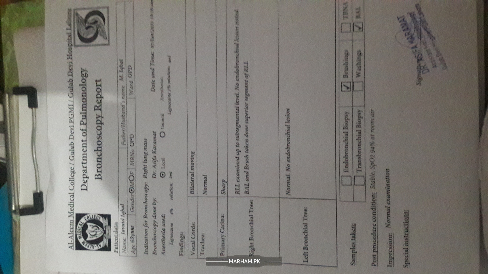 My father had mass in left lung. primary diagnosis was TB .After a while due to doubt bronchoscopy was advised . That was done henceforth. but after this complications got worse ,constant fever and high infection. cough is unbearable . currently on myrin forte and antibiotics . before scopy he was much better. Any suggession what to do. reports are attached