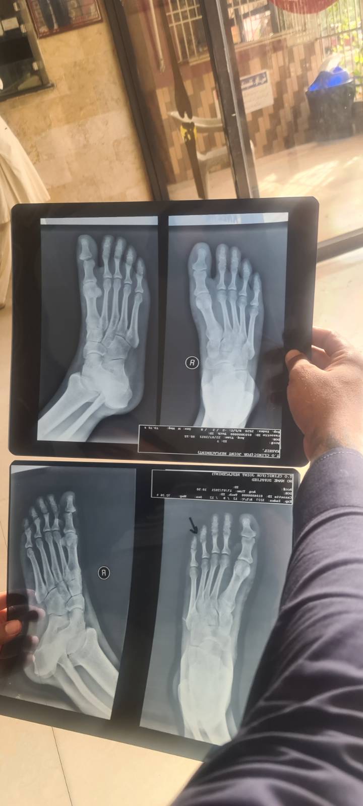 I had a fracture in my right foot thumb and i consulted a doctor they tried to set the bone and then advised me to place the foot kn cold water, then a week later om yesterday i went to have my xray done again and there is no change. Pain is still the same. And the bone i see in the xray is also same. Doctors said that the tissies are damaged and once the swelling is over the bone will be on its place. Please advise if this is gonne be okay on its own or should i get the bone fixed again Above xray is latest and below xray is a week before