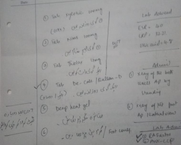my mother is suffering from a lot of pain in her foot along with redness and swelling she did not had any injury or trauma to the foot. she went to an orthopedic who suggested the test for cbc , kindneys and crp iam attaching the results below . please kindly advice what could be wrong with her ,she has also started having some swelling in one hand now. she is also a patient of arthritis and blood pressure im attaching xrays and reports below
