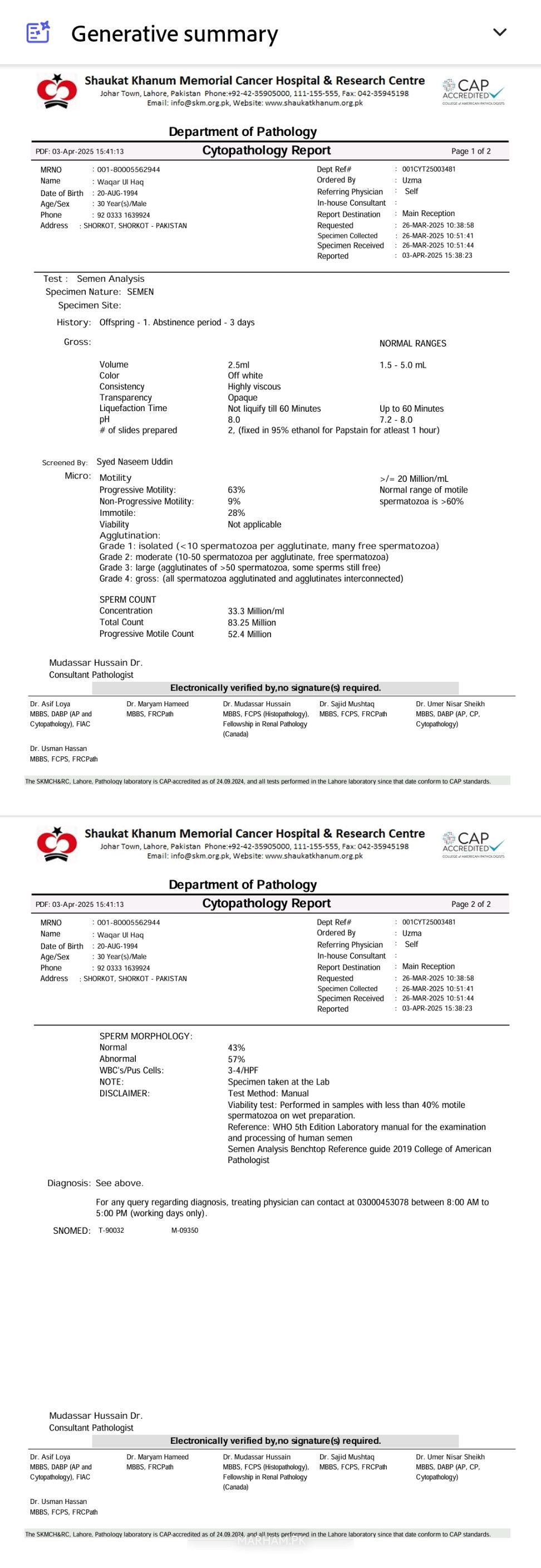 Abnormal sperms are 57% , morphology is disturbed... needs treatment. Visit clinic for expert management