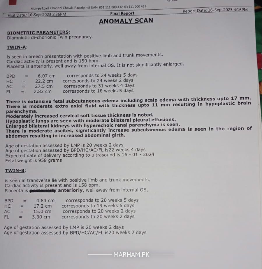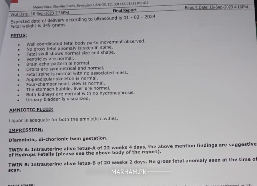 My Gynaecologist is out of town can any doctor answer the below question .Anomaly Scan of my wife is attached. Diamaniotic dichronjc Twin Pregenancy. 1)Twin A is having Hydrops Fetalis is there any chance of survival in long run. Does this affect the health of second baby. 2)Twin B is healthy can Hydrops Fetalis develop after 20 weeks .