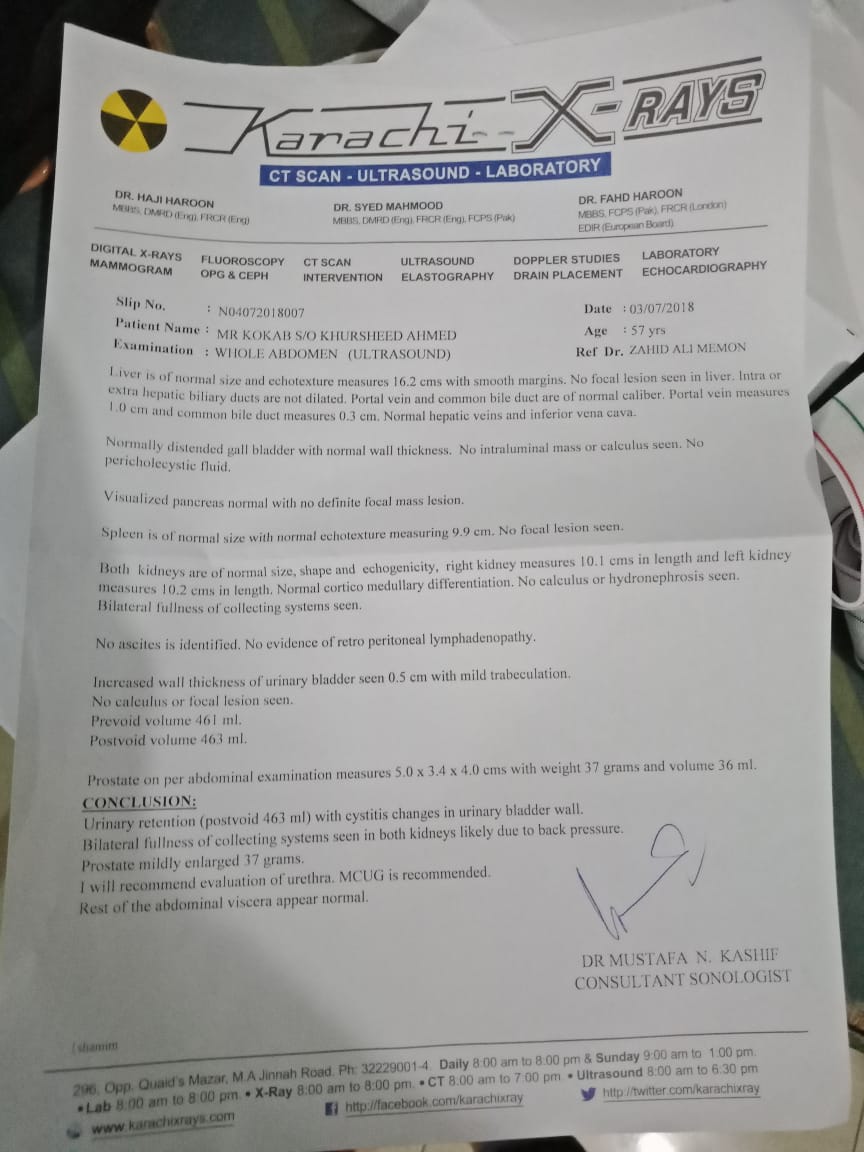 My Father has pain in his lower abdomen. Doctor recommend him ultra sound, but his reports are almost ok as per the doctor. but he also recommend him biopsy and Cystoscopy. Please advise that this is this curable with medicine or not? Below are the attached reports. He is taking the following medicines. Nospa Augmentan Ponstan Forte Caflam Tamsolin