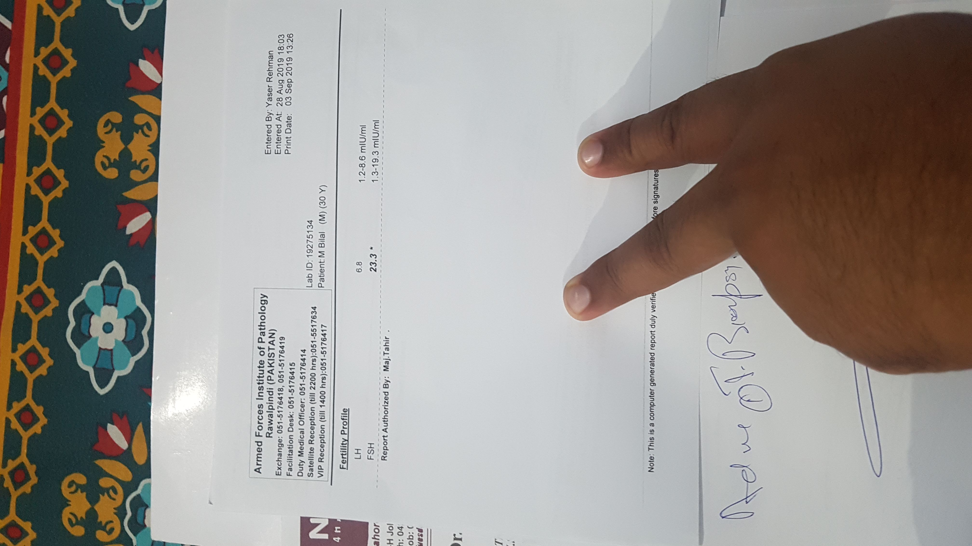 AOA. Muhammad Bilal here, and married for the last 9 months, recently had semen analysis and got nil sperm count, also i have been operated twice in childhood for undescended testis. Also had blood test carried out for FSH and LH Levels FSH is 23.3 LH is 6.8 Yesterday i went for Doppler ultrasound and found out i had cyst on both head of epidymisis. I am worried and cant figure out what to do for the past 3 weeks. Had checkup in CMH Rawalpindi. Can i have ur personal number to discuss more and also i will visit your place for proper chkup and treatment