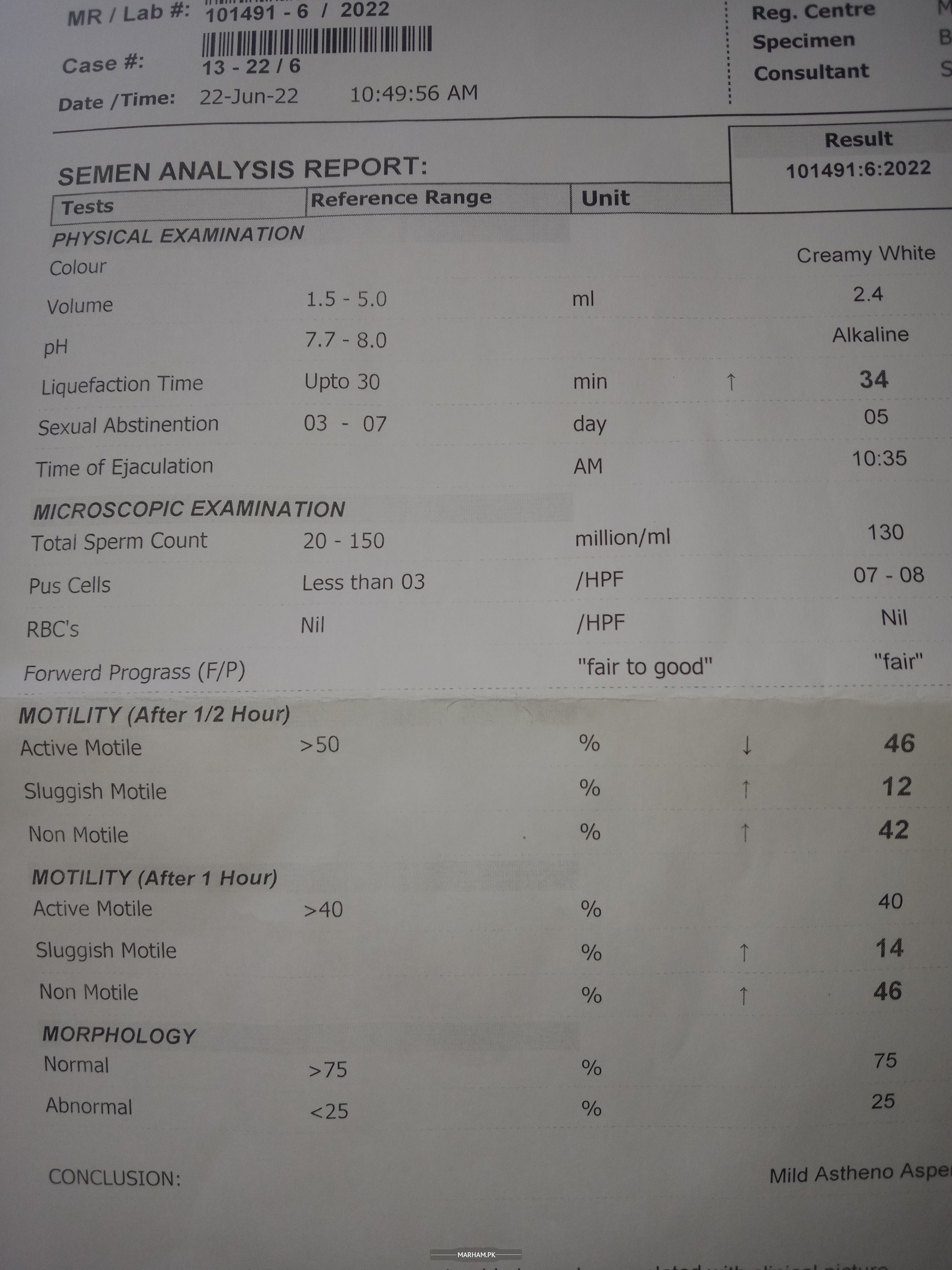 Aslam-o-alikum doctor mane semen test krwaya tha phly dafa TU bilkul thek tha or ab two years bad phr krwya he TU bht weekns hui he koi mjy Bata skta he Mari report dakh k me report send kro ga