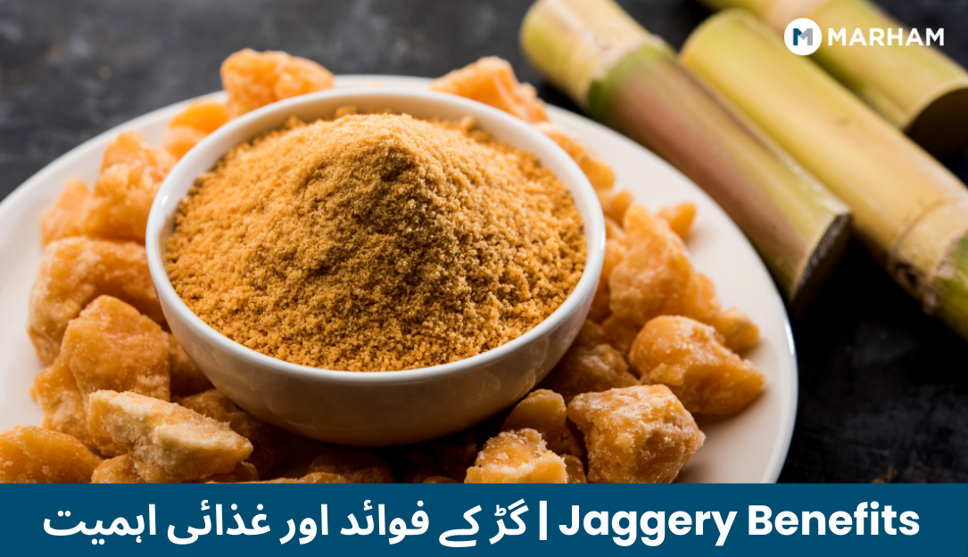 Jaggery (gur in Urdu/Hindi) is an unrefined sweetener made by boiling sugarcane juice or palm sap until it solidifies. Unlike white sugar, jaggery retains molasses during processing, which preserves certain minerals. This is why jaggery has a golden-brown color and earthy taste.