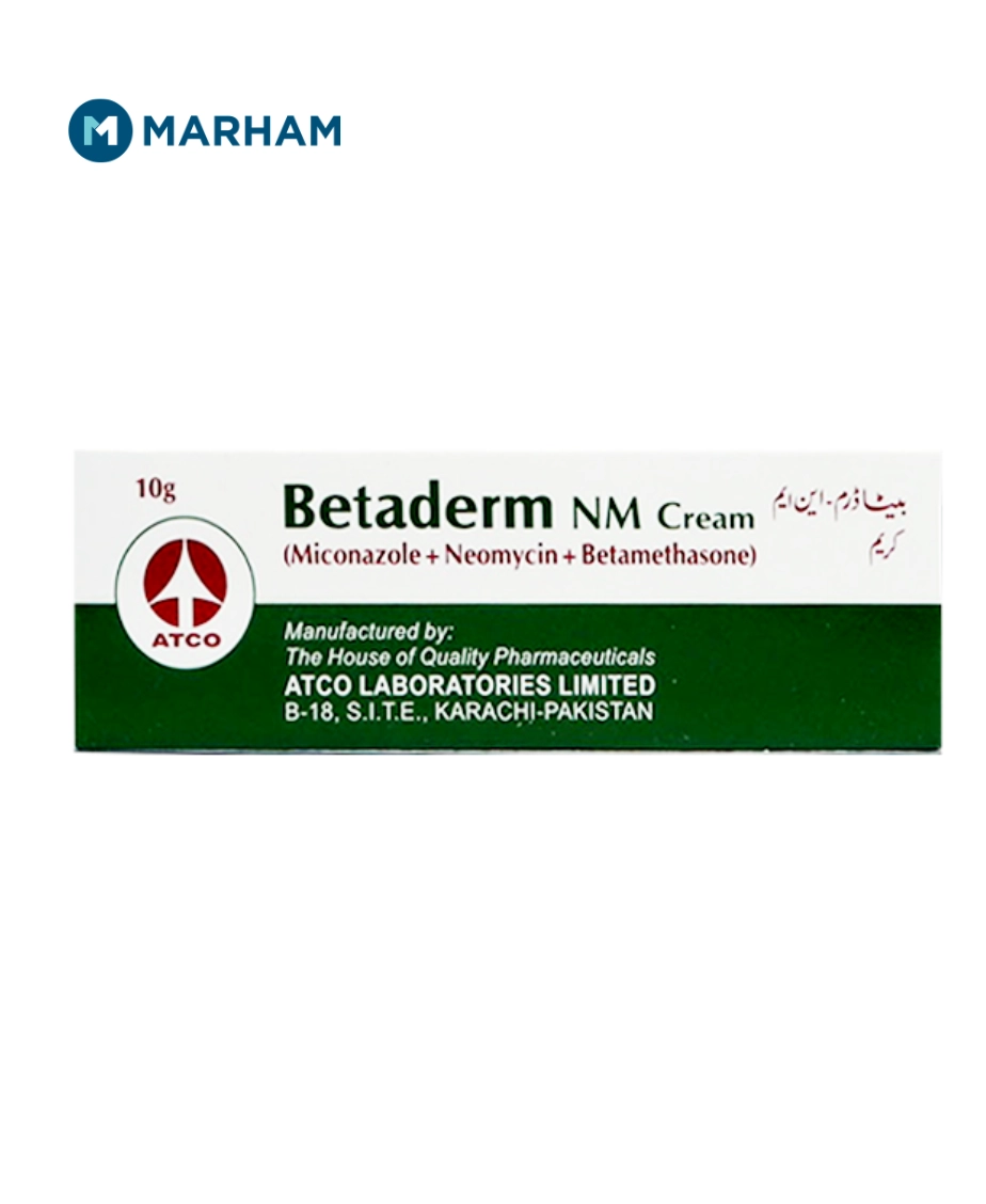 Betaderm NM Cream uses include the treatment of inflammatory skin conditions accompanied by bacterial and fungal infections. It contains three active ingredients: Betamethasone (reduces inflammation and itching), Neomycin (kills bacteria), and Miconazole (kills fungus), providing comprehensive relief from various skin problems including eczema, dermatitis, and infected skin conditions.