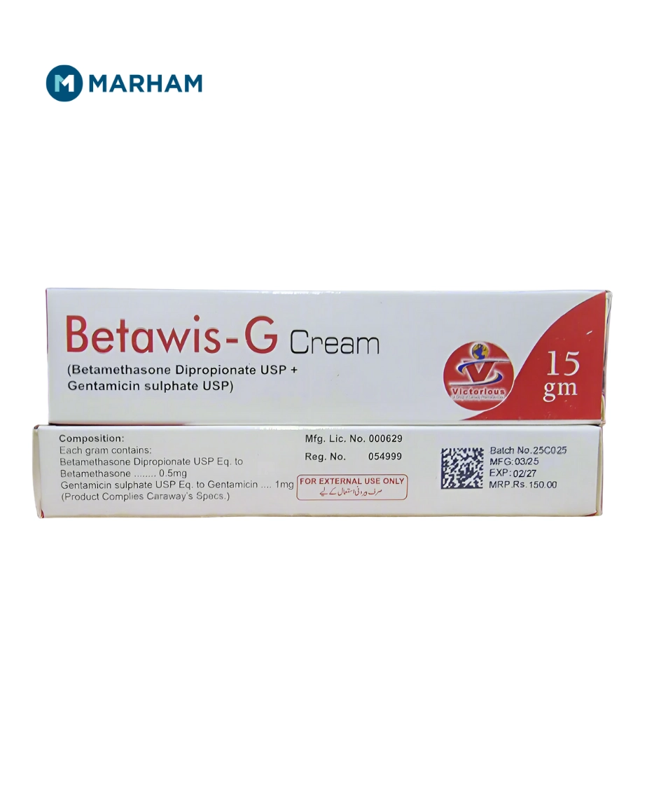 Betawis G Cream uses include treating eczema, dermatitis, and infected skin rashes. It is used to treat skin conditions caused by inflammation and bacterial infections. It contains two medicines: betamethasone, which reduces redness, swelling, and itching, and gentamicin, which treats bacterial infections on the skin.