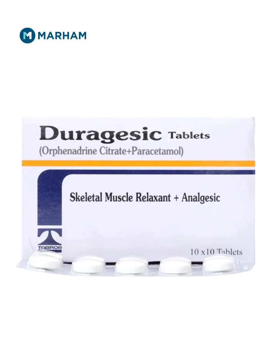 Duragesic Tablet uses include relief of muscle pain, spasms, and inflammation associated with arthritis, sprains, strains, and tension headaches. This muscle relaxant combination contains Paracetamol 450 mg (analgesic and antipyretic) and Orphenadrine Citrate 35 mg (central muscle relaxant). Paracetamol reduces pain and fever while Orphenadrine acts on the central nervous system to relieve muscle stiffness and improve mobility.